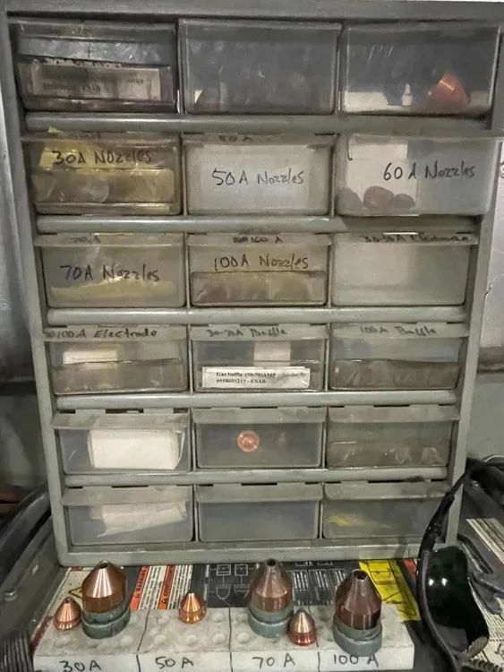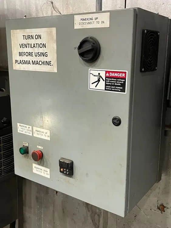 5′ x 10′ Cutting Area, 100 amp ESAB Power Supply, Pierce 3/4″ mild steel and cut 1-1/4″ edge, ESP-101 Power Supply, Full set of manuals, Consumables and a few spare parts, Software dongle and files, Dust collector, Power Required: 230V 1Ph, 20A for the table; 480V 3Ph, 25A for the ESP-101 Power Supply