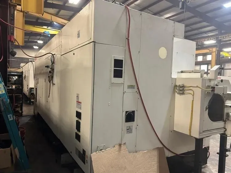 2011 MAZAK SLANT TURN NEXUS 550M CNC lathe features a 12.5" spindle bore, 80" machining length, 24" chuck, 3-axis control, and 60 hp power. Includes chip conveyor, 24" air chuck, and multitap transformer. Available mid-January 2026 approx.