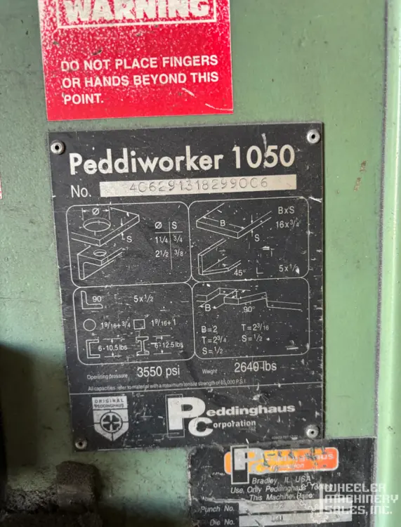 PEDDINGHAUS Peddiworker 1050 Hydraulic Ironworker, used condition. Key specs include 105 T tonnage, 5" angle capacity, and 5.5 hp power. Ideal for high-performance cutting and punching.