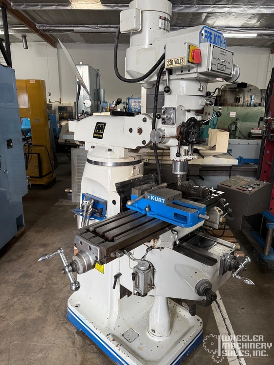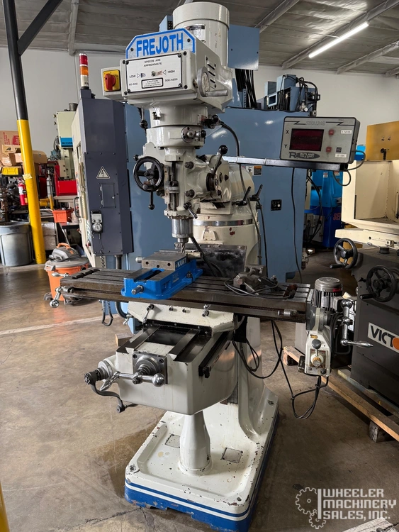 1998 Frejoth AM-2V Vertical Mill available, featuring a 9" x 42" table, 30" longitudinal travel, 3 HP motor, and a belt change head. Includes servo X-axis power feed and one-shot lube system. Perfect for precision milling needs.