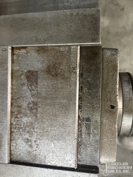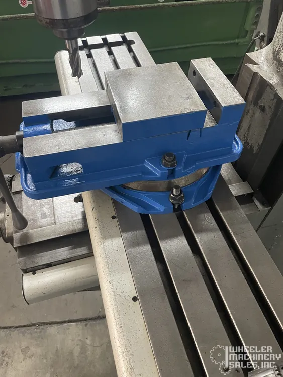 Bridgeport J-Head Vertical Mill #8074 is available. Features a 9" x 42" table, 5" quill travel, R8 spindle with 8 speeds (80-2,720 RPM), powered by a 1 HP motor. Equipped with a swiveling 6" mill vise and belt change head. Ideal for precision milling tasks.