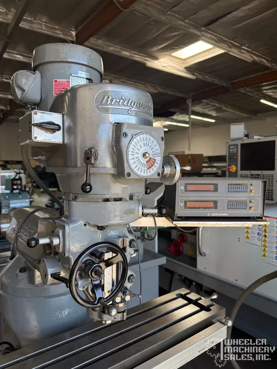Bridgeport Series I Vertical Mill #7974 #1 offers a 9"x42" table, 5" quill travel, and variable R8 spindle speeds up to 4,200 RPM. Features include DRO, one shot lube, variable head, and work lamp. 220V, 3-phase.