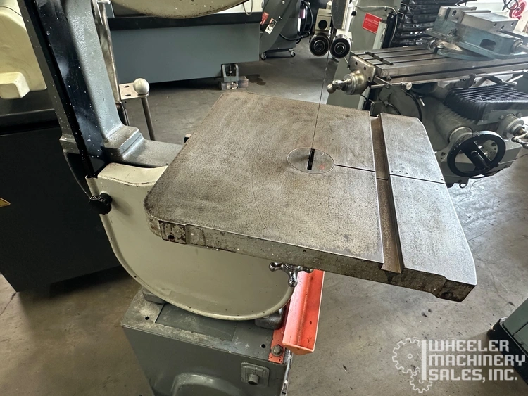 For sale: Rockwell Model 14 28-200 Vertical Band Saw. Features 14" wheel diameter, 1 HP belt drive motor, and tilting table. Specs: 6-1/4" max. under guide, 13-3/4" throat clearance, 91-1/2" - 94" blade lengths. Table: 14" x 14" with 3/4" x 3/8" miter gauge slot.