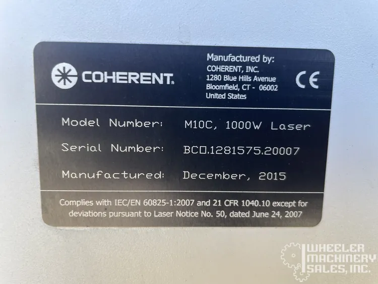 2015 COHERENT META 10C laser cutting system available. Used, reliable model with 1000W power. Handles sheets up to 1.2m x 1.2m. Features high-speed operation at 2000 ipm with X, Y, Z axes dimensions of 50", 50", and 9.5".