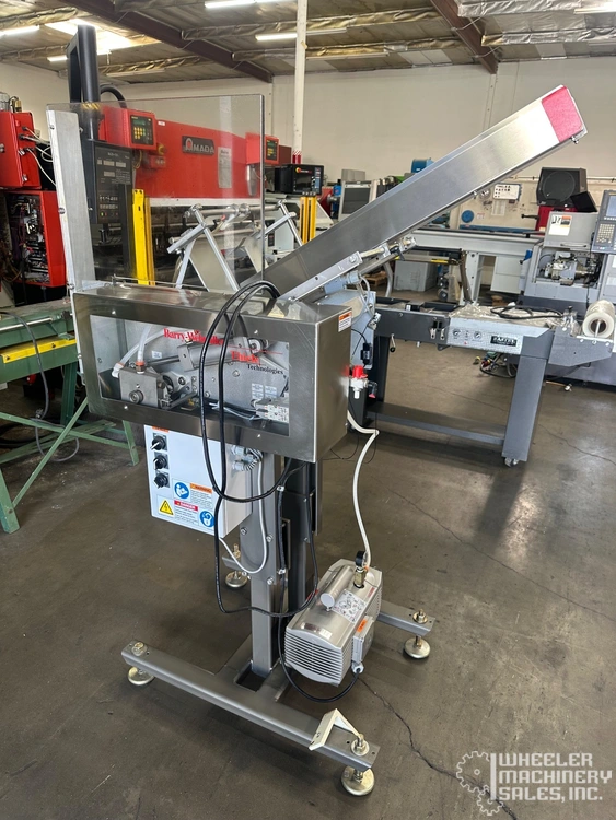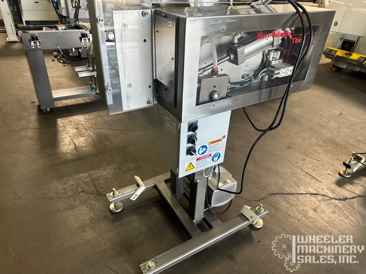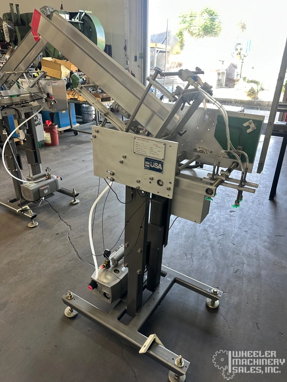 Recipricating placer by Barry Wehmiller/Thiele Technologies model t7300a. Features automatic operation, stainless steel adjustable magazine, three placers on single adjustable fixture, on board oil less vacuum pump by Becker, type v1416, operates on 110/120 volt/1 phase/60 Hz/2 amp (add 9. 5 amps for vacuum pump), mounted on "h" floor stand with four threaded leveling feet and telescoping placer position (shown at 36" placing height from floor), requires 80 psi air supply @ 2 cfm, supply magazine has low level sensor, adjustable angle and width. Formerly used in pharmaceutical packaging.