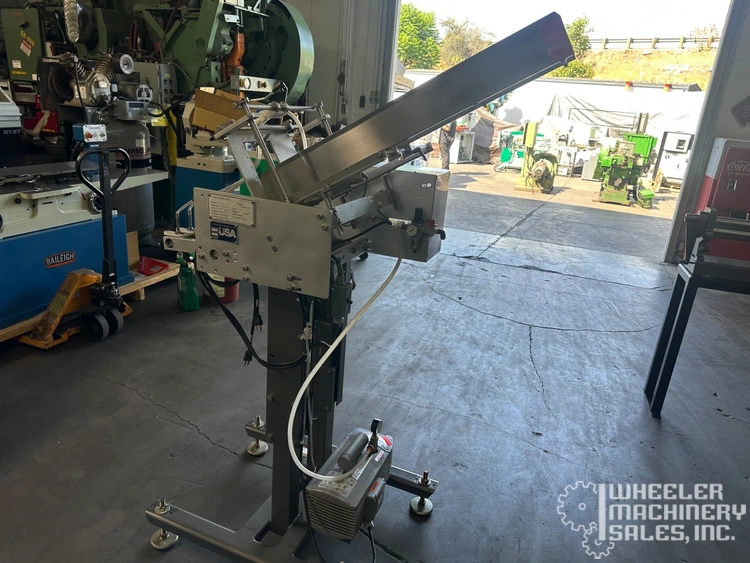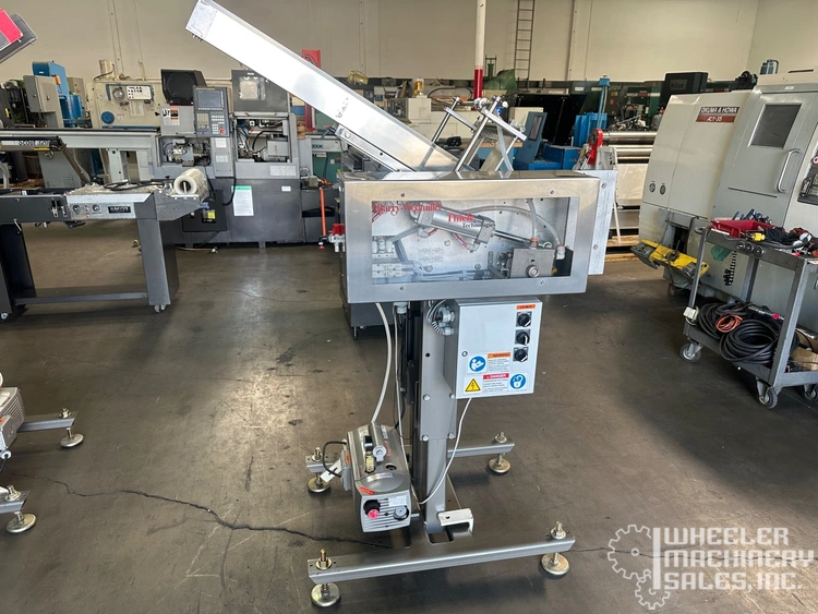 Recipricating placer by Barry Wehmiller/Thiele Technologies model t7300a. Features automatic operation, stainless steel adjustable magazine, three placers on single adjustable fixture, on board oil less vacuum pump by Becker, type v1416, operates on 110/120 volt/1 phase/60 Hz/2 amp (add 9. 5 amps for vacuum pump), mounted on "h" floor stand with four threaded leveling feet and telescoping placer position (shown at 36" placing height from floor), requires 80 psi air supply @ 2 cfm, supply magazine has low level sensor, adjustable angle and width. Formerly used in pharmaceutical packaging.