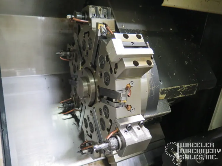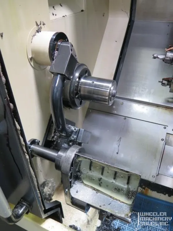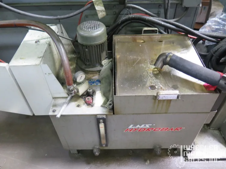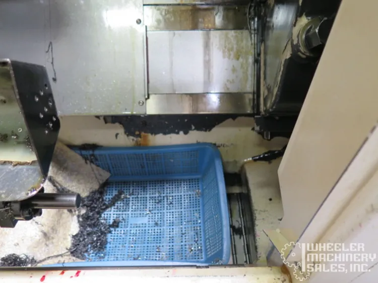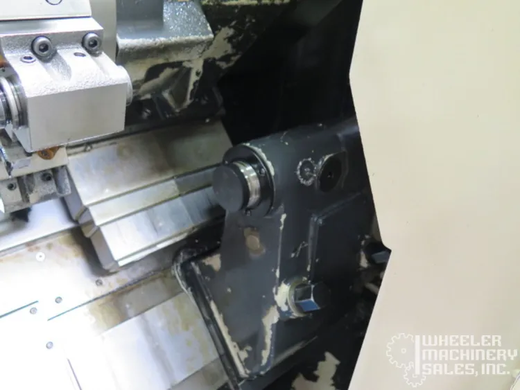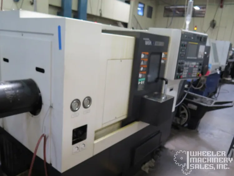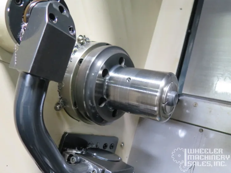 2015 Hyundai WIA E160A CNC Lathe, used condition. Max Turning Diameter: 11″, Max Length: 11.8″. Features 6″ chuck, 6,000 RPM spindle, 12-position turret. Includes Fanuc i Series Control, LNS Eco Load S2 Bar Feeder, tailstock, chip conveyor.