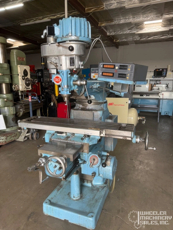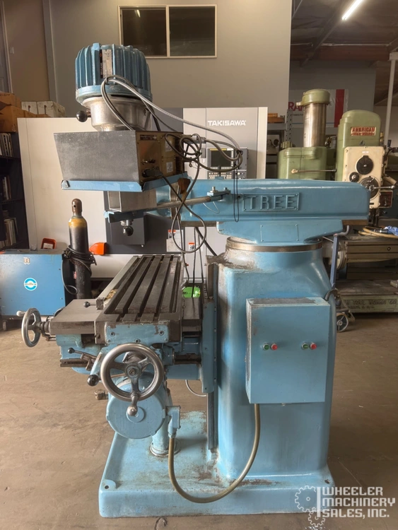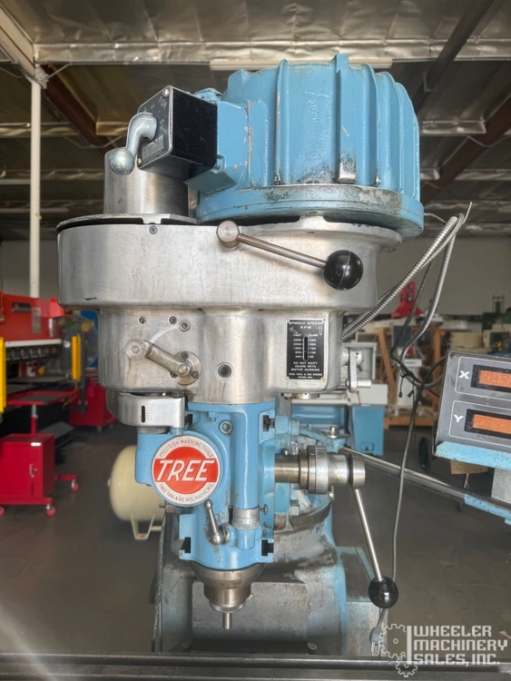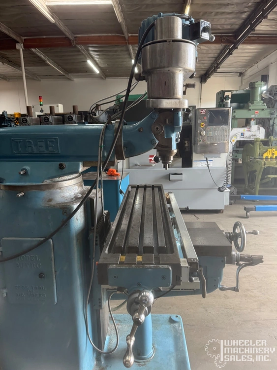 Used TREE 2UVRC Vertical Mill equipped with Mitutoyo Digital Readout, power feeds, and one-shot lube system. Features 10.5" x 48" table, 30" longitudinal travel, and variable spindle speeds up to 3,300 RPM. Compact and efficient for various tasks.