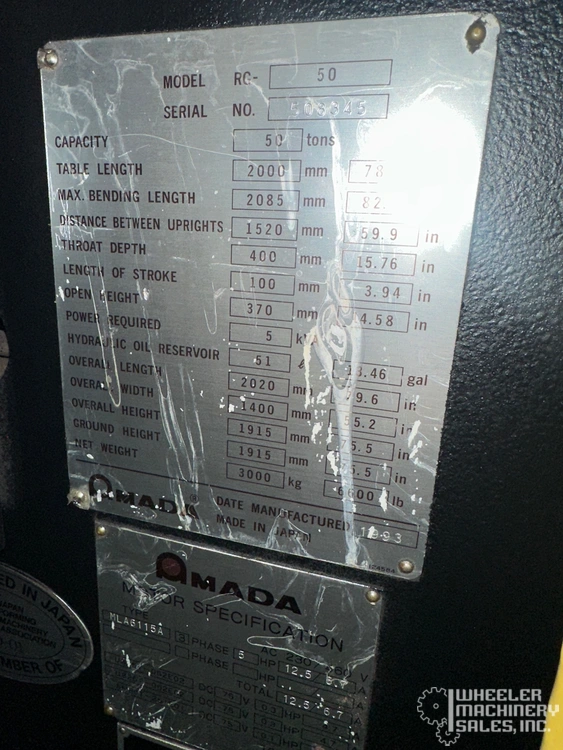 1993 Amada RG-50 CNC Press Brake, 55-ton hydraulic, 6' length, 59.84" between housings, 39.3" stroke, 3-axis control. Ideal for precise and reliable metal forming applications. Used condition.