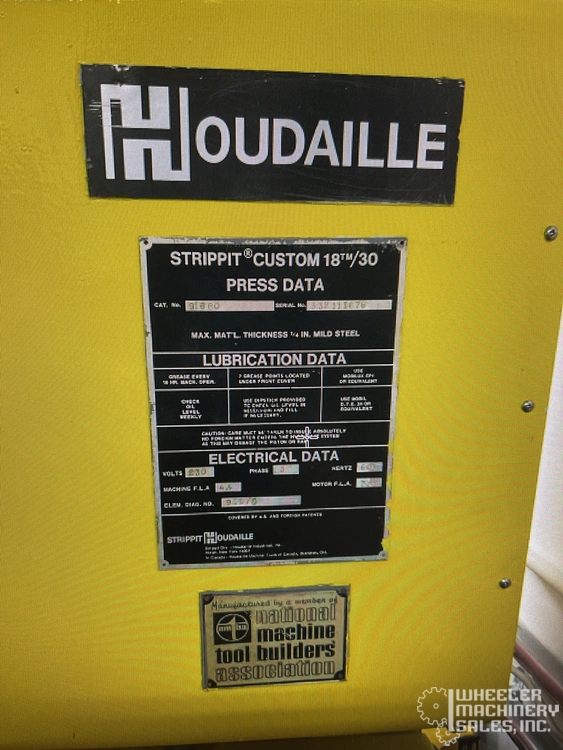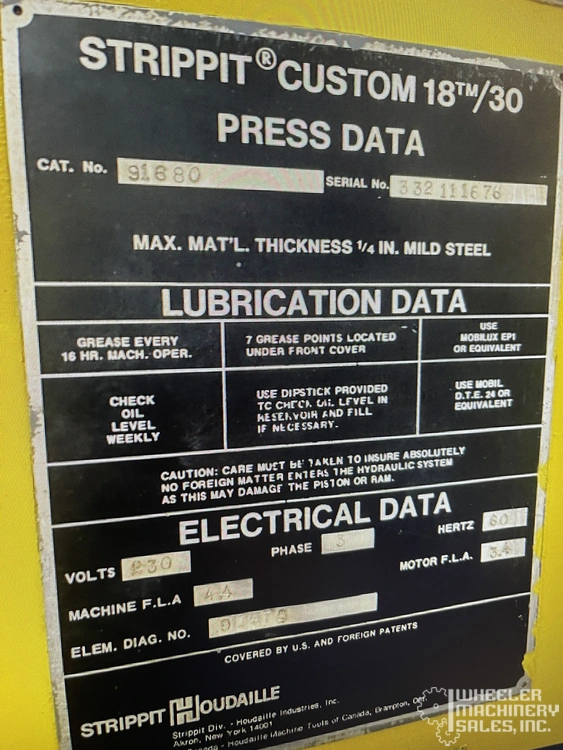 Strippit Custom 18/30 Single Station Punch, capable of 30-ton max punching. Material size: 18" x 30", 18" throat depth, 5/8" stroke, 165 strokes/min. Tooling included. Features a duplicator. Operates on 240/480V, 3 phase. Used condition.