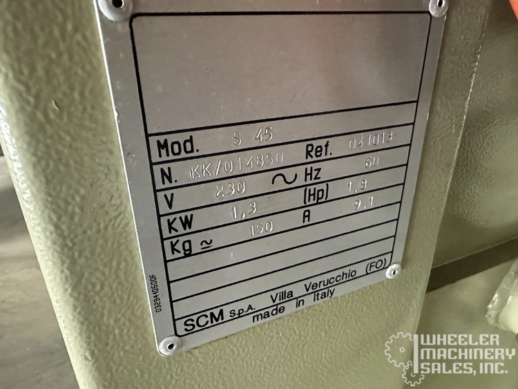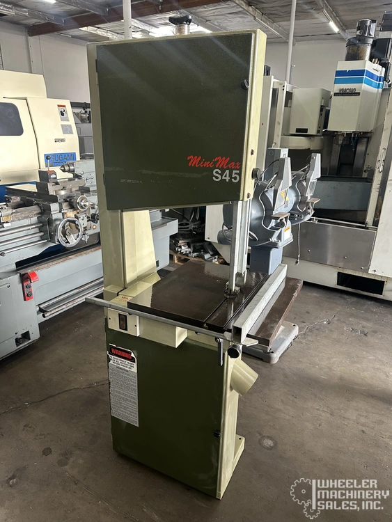 SCM Model S45 Vertical Bandsaw available, featuring a 1.8HP motor and 700 RPM flywheel speed. Max cutting dimensions: 11.8" height and 17.3" width. Table size: 23-3/4" x 20-1/2". Ideal for efficient workshop use. Used condition.