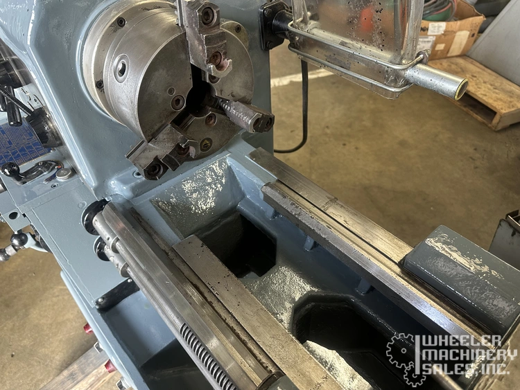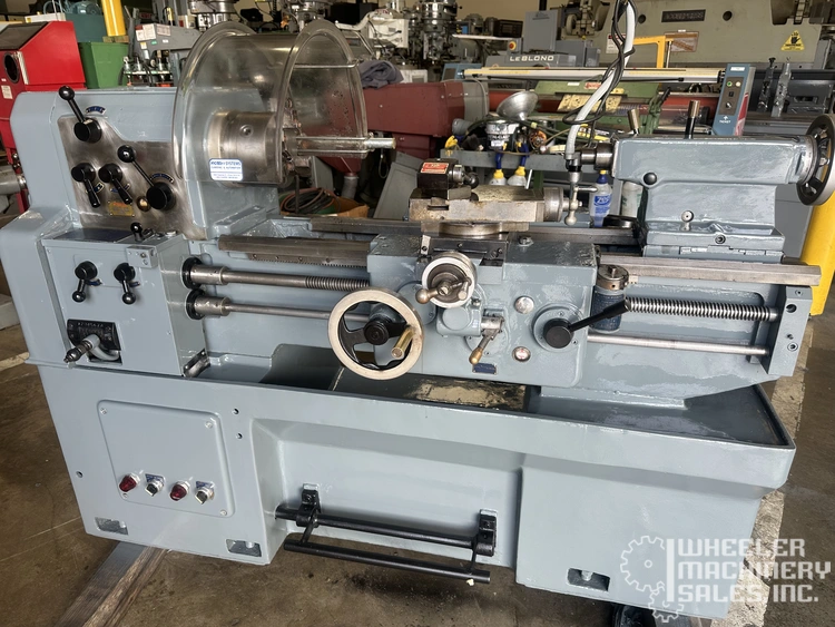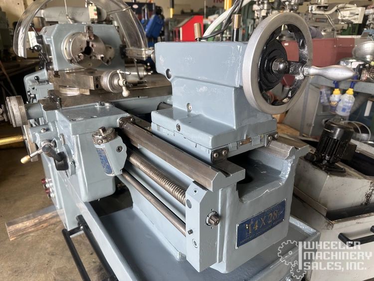 Cadillac 14" x 28" Engine Lathe, Model #7072, used. Features a swing over bed of 14", 28" between centers, spindle bore of 1.50", 10 HP motor, and equipped with a 3-jaw chuck, KDK tool holder, and coolant. Dimensions: 76"x34"x52".