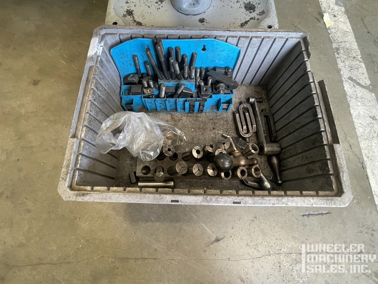Used Bridgeport Variable Speed Vertical Mill, model #7143 #2. Features a 9" x 42" table, 5" quill travel, R8 spindle, variable speeds up to 4,200 RPM, 1 HP motor, and 220V 3-phase electrics. Includes X-Axis power feed, variable change head, mill vise, and lamp.