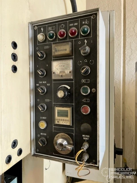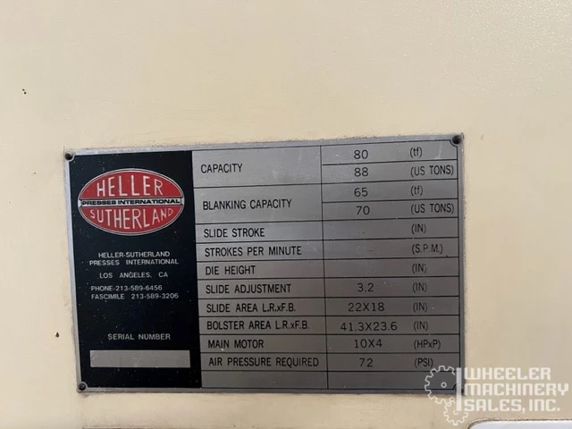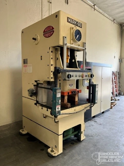 Used Sutherland Mark-88 OBS Punch Press with 88-ton capacity and adjustable stroke speed from 55 to 130 SPM. Includes bolster plate, dual palm button console, and light curtains. Slide dimensions are 22" x 18", powered by 10 HP motor.