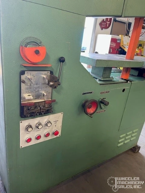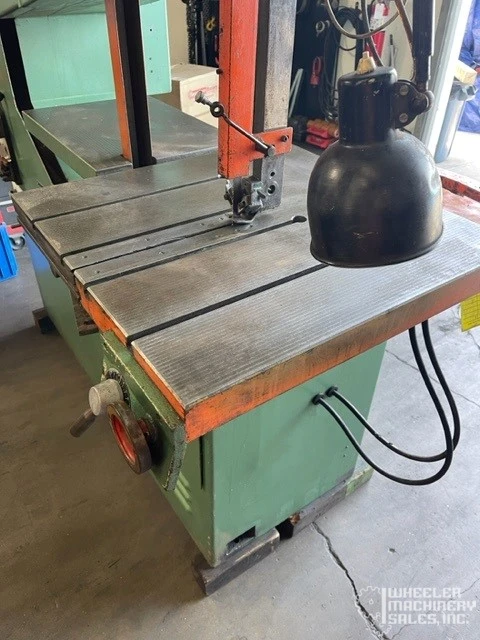 For sale: Used Dake Johnson VH-40 Vertical Band Saw. Features a 41" throat, 13" max work height, and 26-1/4" table. Equipped with hydraulic feed, blade grinder, welder, chip blower, and work light. 220/440V, 3PH electrical system.