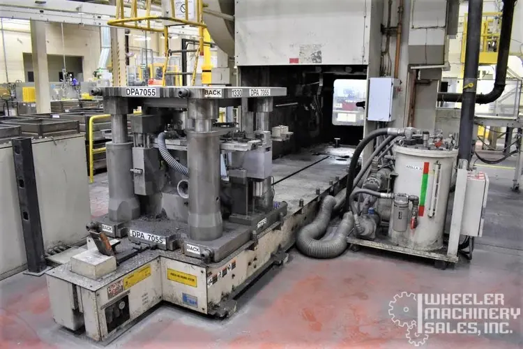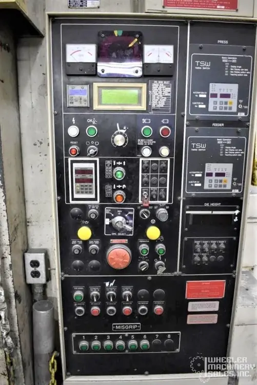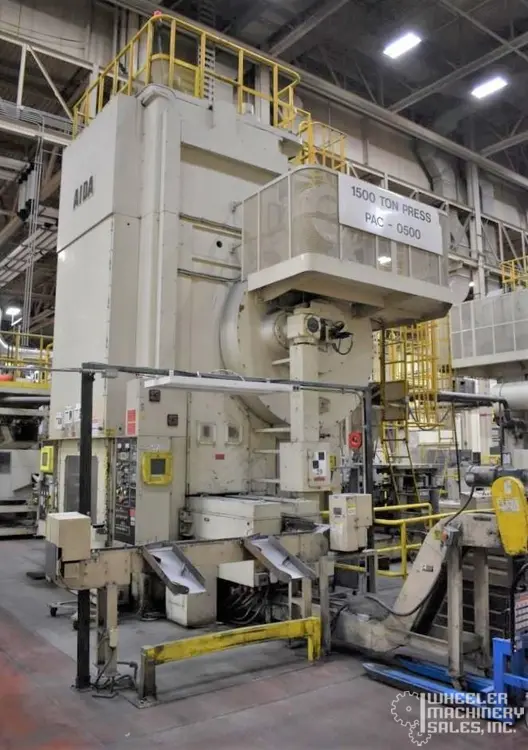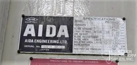 1998 Aida PK-1500 Knuckle Joint Press, 1500-Ton capacity with a stroke of 9.84". Features include a 47.2" x 47.2" bolster area, Helm Loadgard control, and a 125-HP DC motor. Includes die change and 2-axis transfer systems. Total weight: 260,000 lbs.