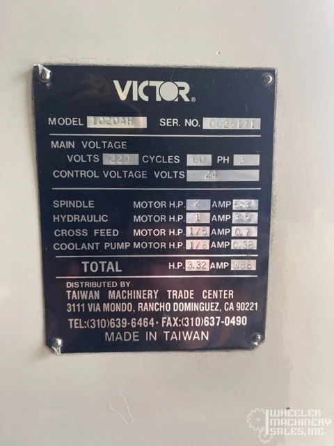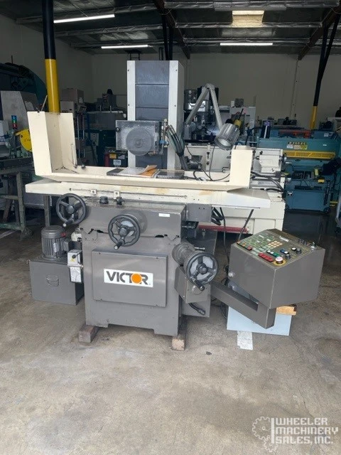 Victor PFG-1020AH used hydraulic surface grinder for sale. Features 10" x 20" table, 3,500 RPM spindle speed, and 3 HP spindle motor. Includes electromagnetic chuck and precise feed controls for detailed work. Compact shipping size.