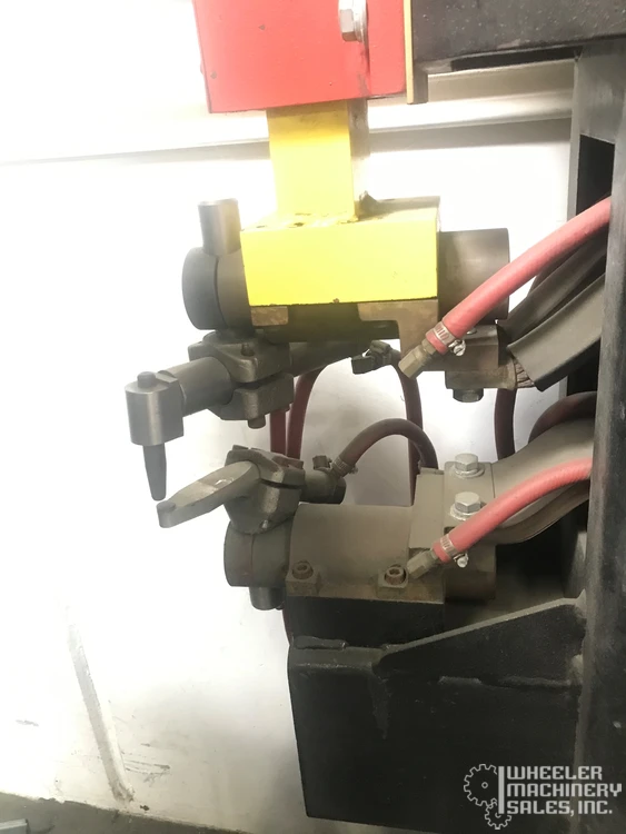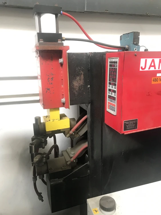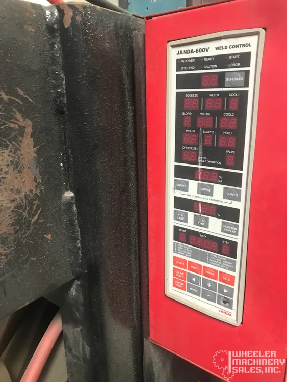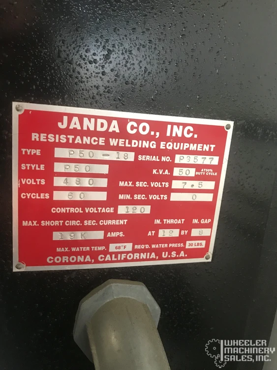 Janda P50-18 used spot welder, 50 KVA, 12" throat depth, 8" gap. Equipped with 600V digital weld control, pneumatic clamping, MTA water chiller. Input voltage: 480V, refrigerant R134A, charge: 0.710 KG. Ideal for precision welding tasks.