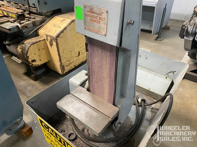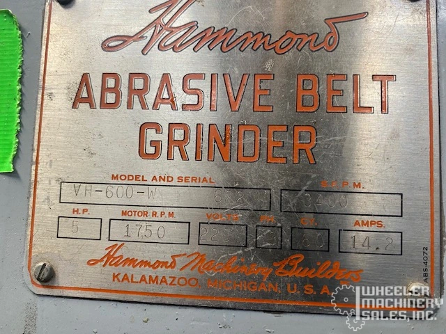 Hammond VH-600-W used 6" abrasive wet belt grinder, #5894 #2. Features 3 HP motor, 3400 SFPM belt speed, tilting table, protractor, coolant pump, and 15-gallon tank. Ideal for precise grinding with vertical or horizontal positioning.