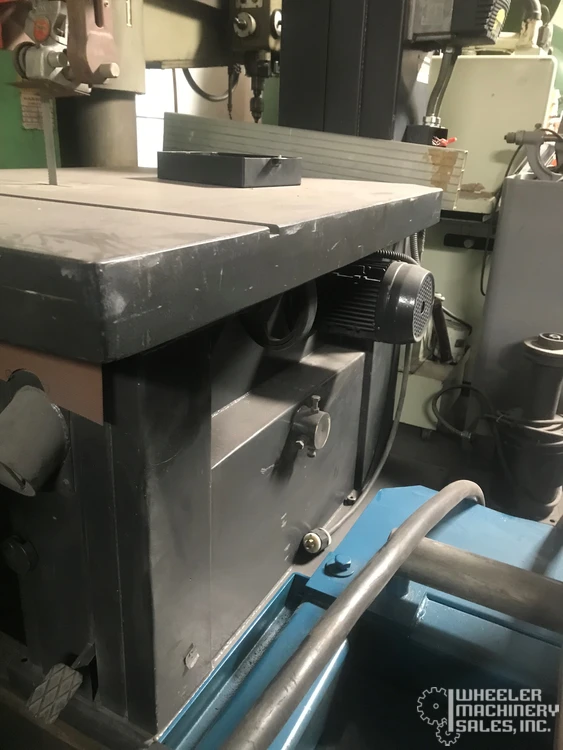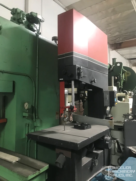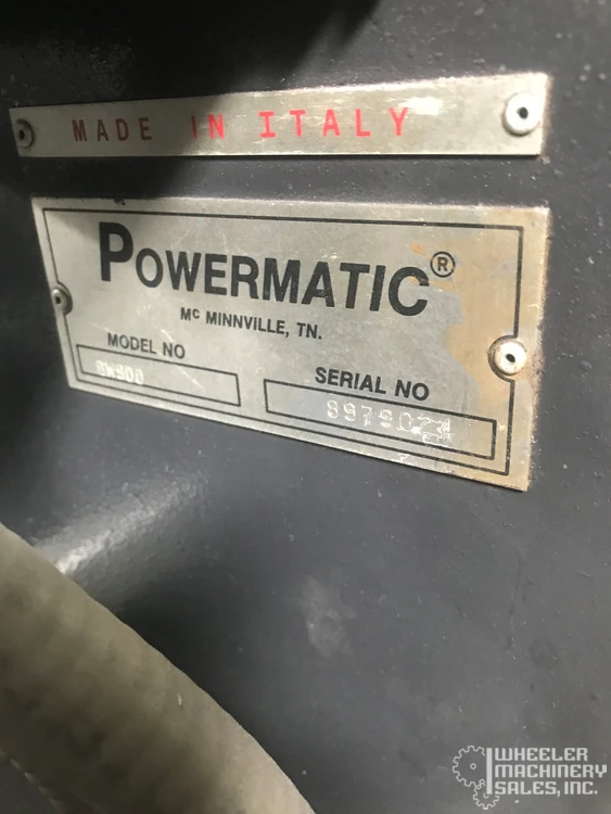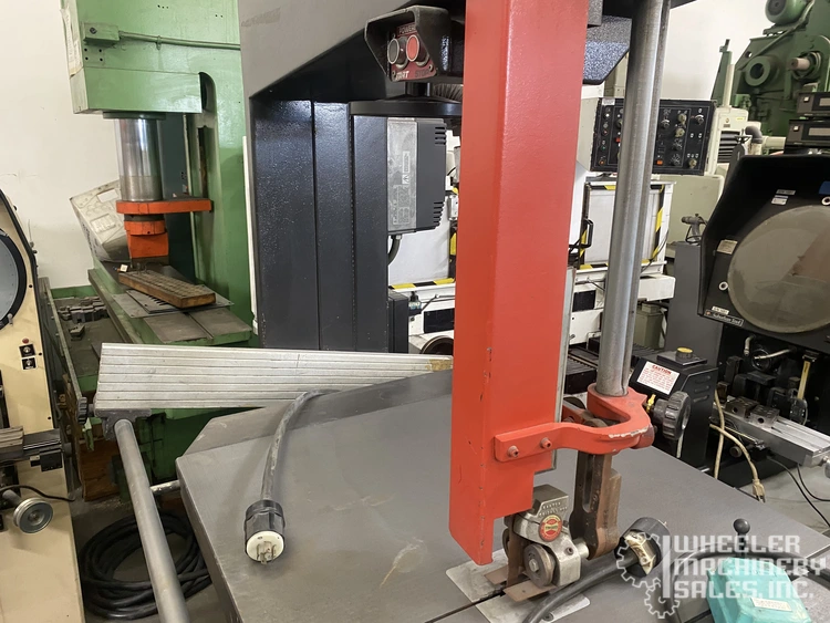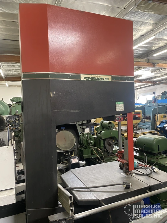 POWERMATIC BW900 vertical bandsaw, used, featuring a 34 1/2" throat depth and Baldor Variable Speed Drive. Max. work height: 19", table size: 45" x 32". Includes 7 1/2 HP motor, rip fence, and roller guides. Ideal for precision cutting.