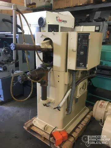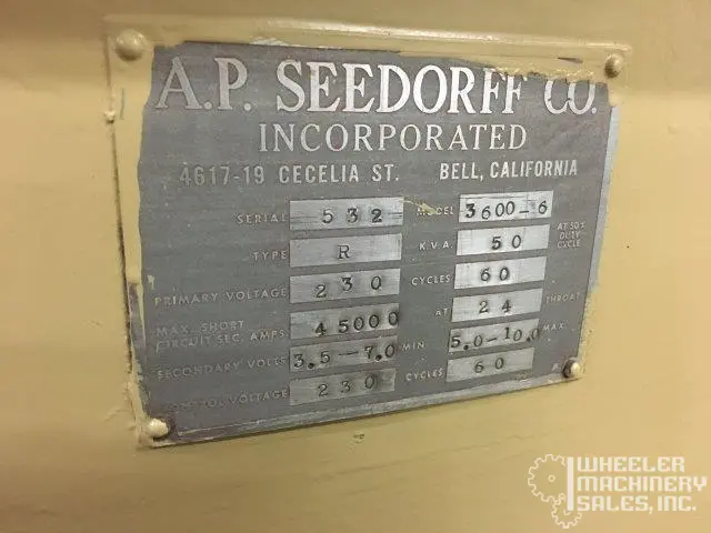 For sale is a used SEEDORF/JANDA 3600-6 spot rocker arm welder, rebuilt by Janda. Features include 50 KVA power at 50% duty cycle, Entron 105F Control, 230V primary voltage, and a 24" throat distance. Compact 58"x31"x64" dimensions.