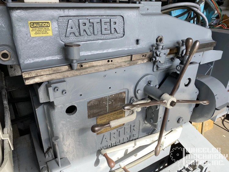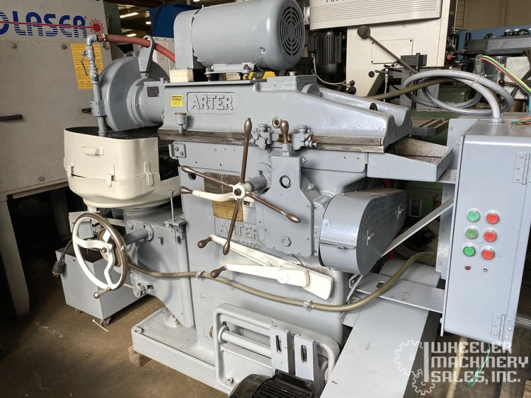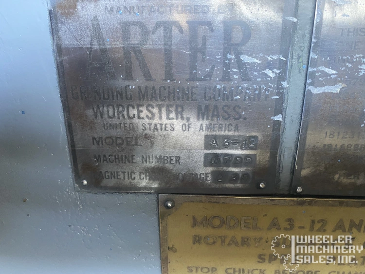 Arter A3-12 horizontal-spindle rotary surface grinder available; features a 12" magnetic chuck, 20" swing with coolant guards, and a 10 HP spindle motor. Ideal for precise grinding with speeds up to 1,500 RPM. Compact design, weight approx. 4,500 lbs.