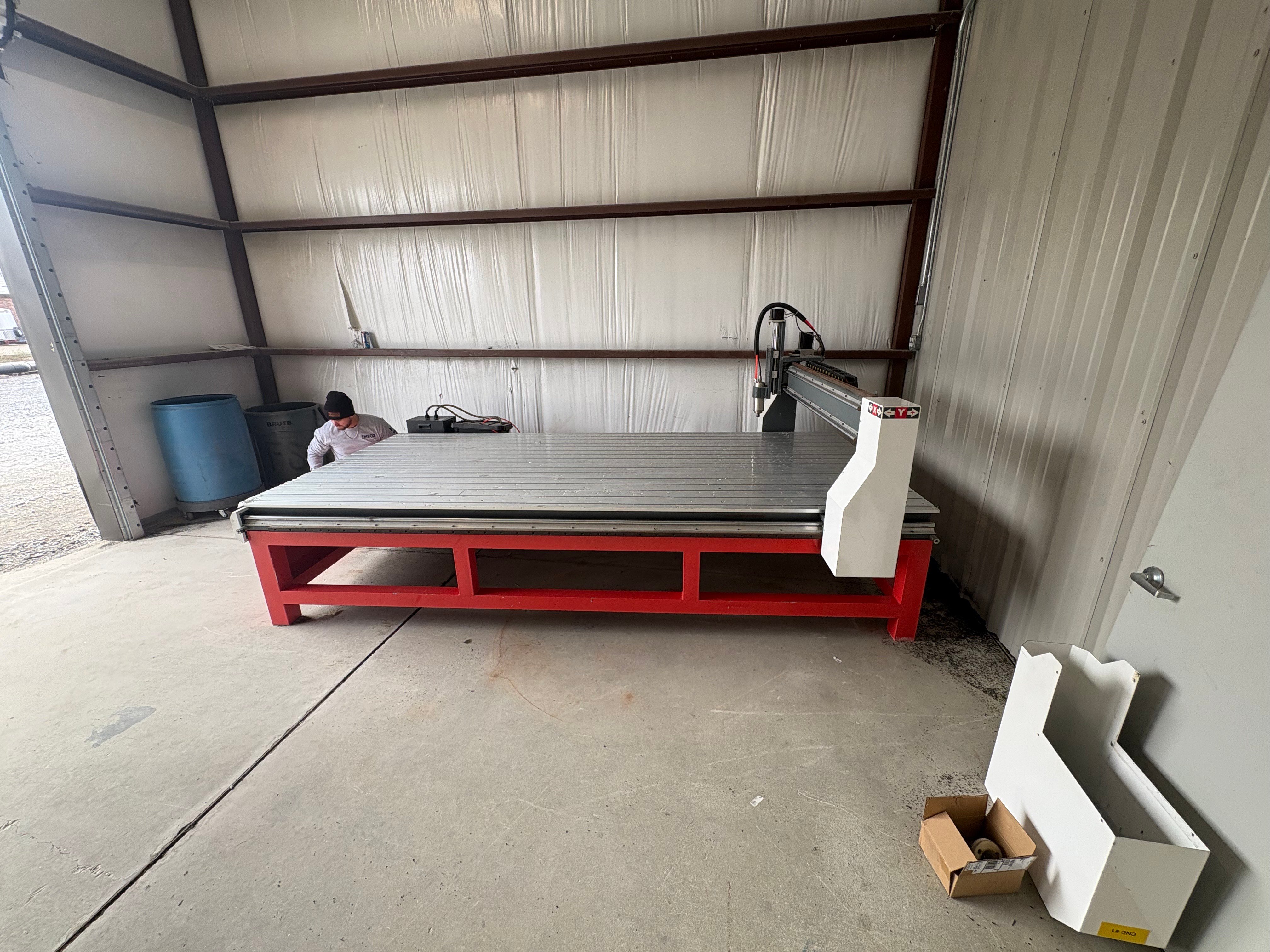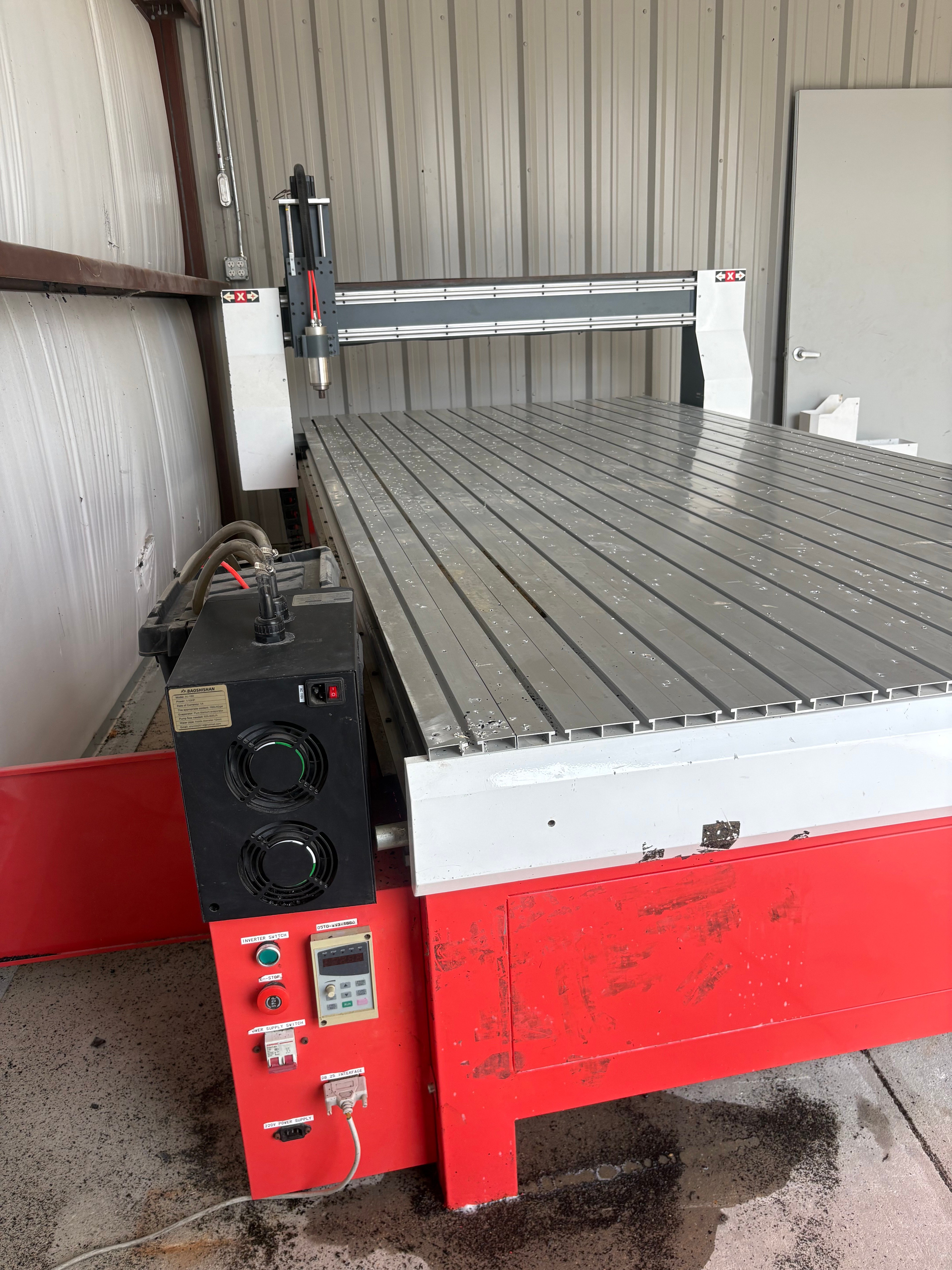 5’ X 10’ CNC Router with Mach 3 Controller, T - Slotted Table, Dual Motor Drive, High Frequency Water Cooled Spindle, Dust Collection Cover Attachment and Welded Steel Frame.