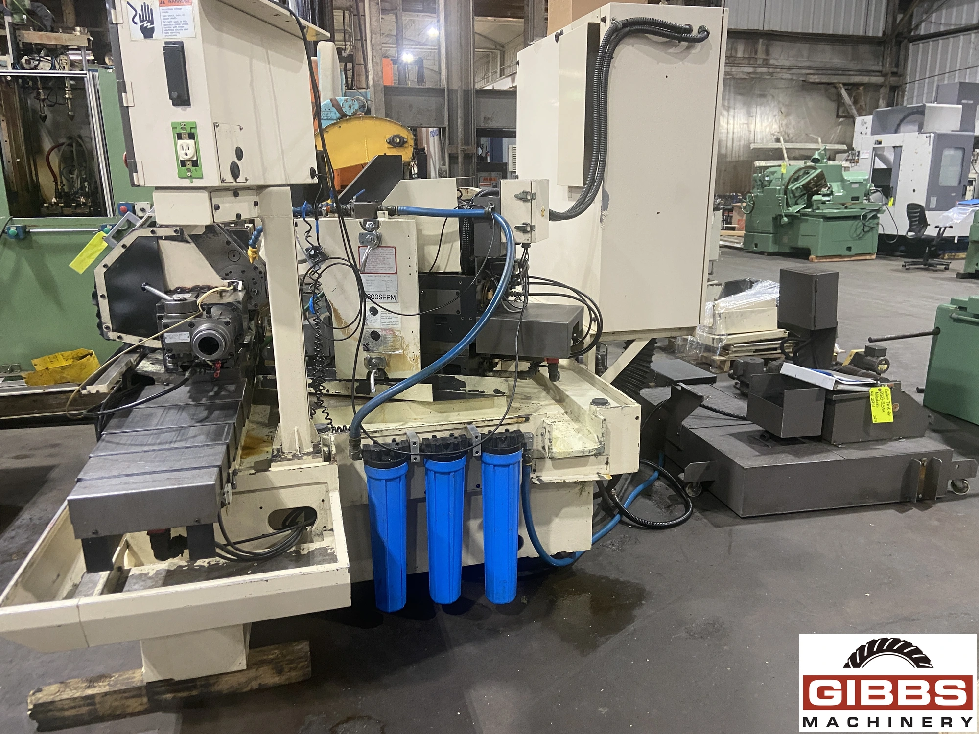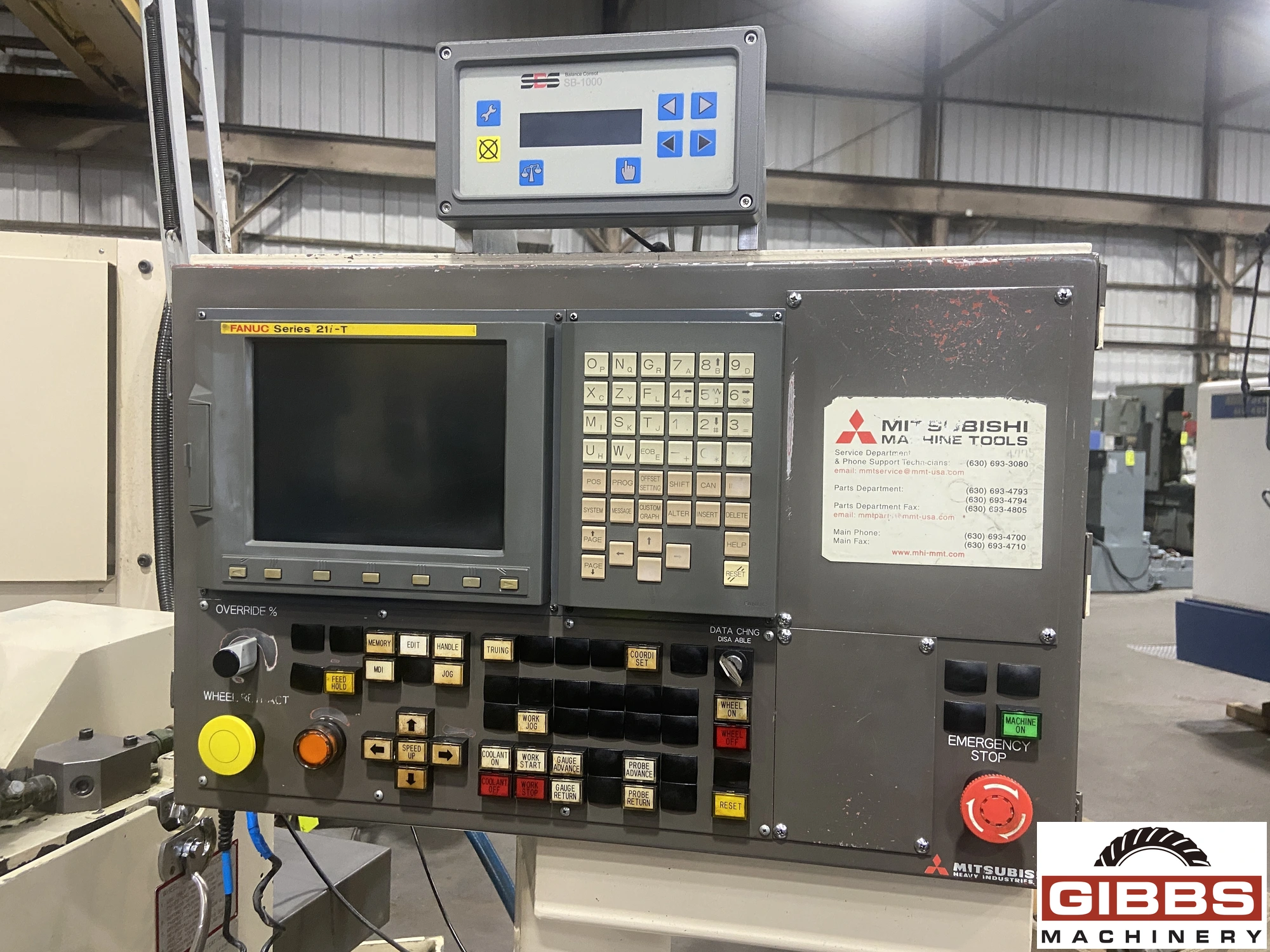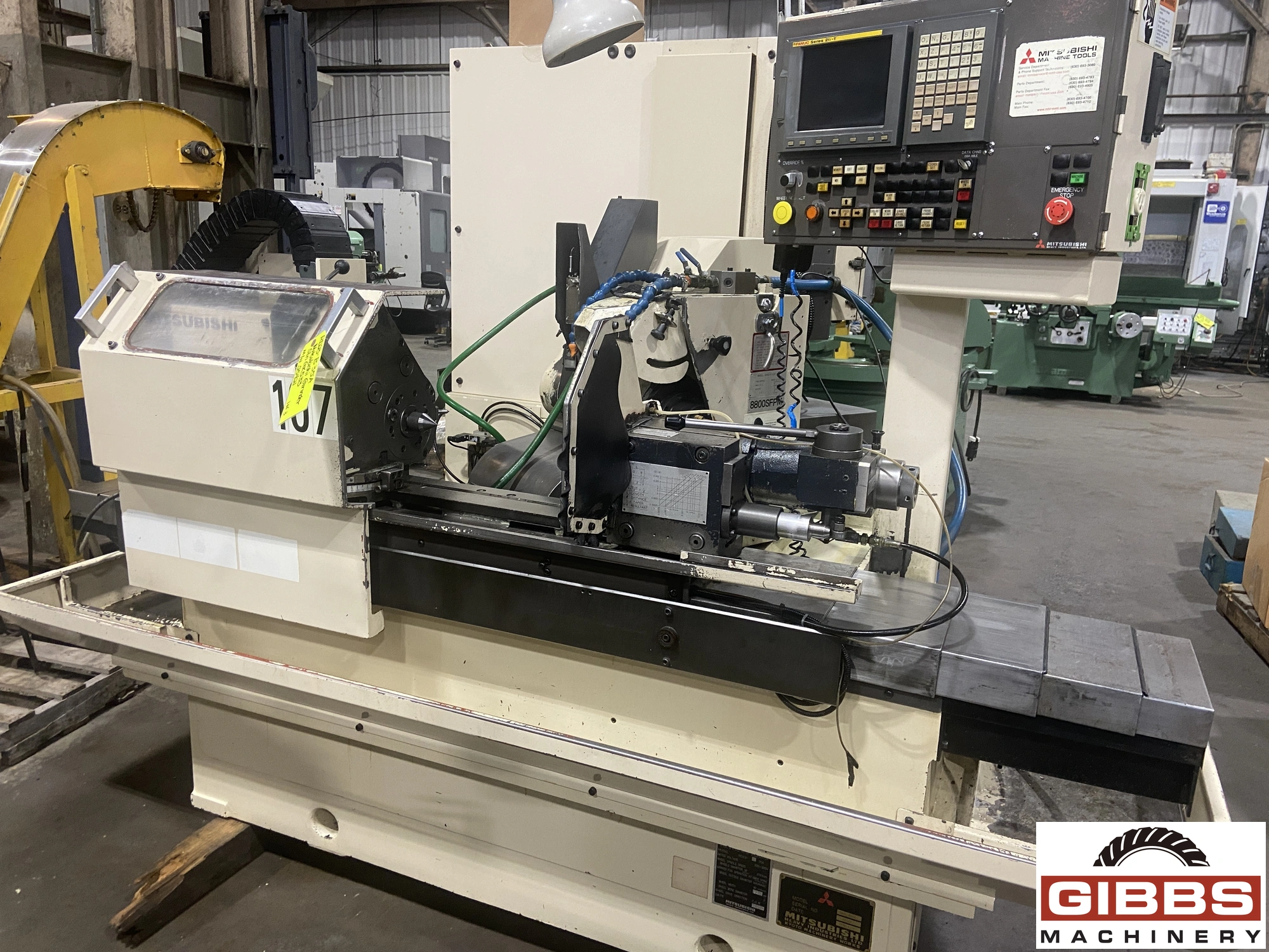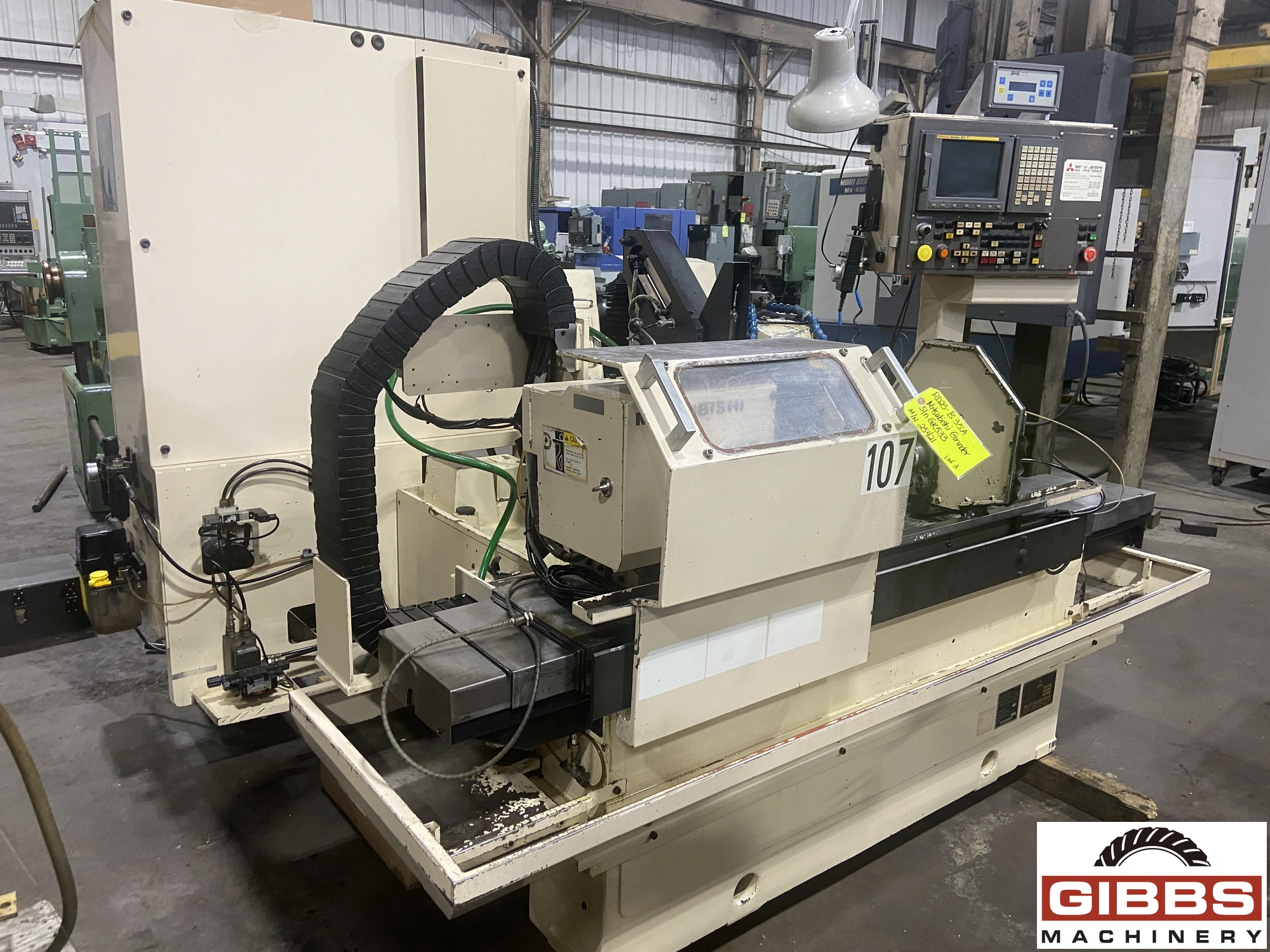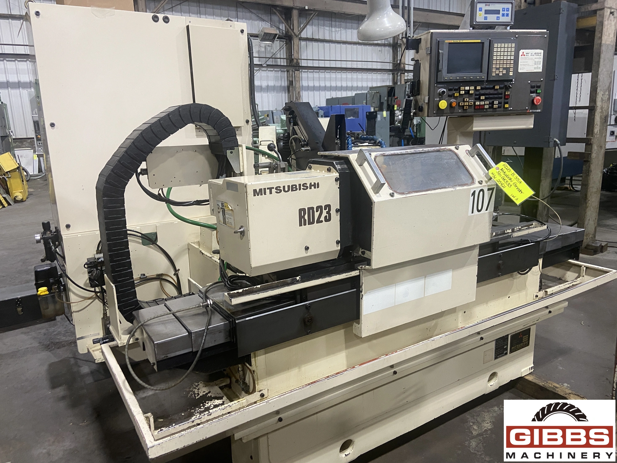 The MITSUBISHI RD23-B35A is a CNC (Computer Numerical Control) angle head grinder. It is a cylindrical grinder capable of both plain and angle head grinding. This machine features simultaneous two-axis control and is equipped with a single-point diamond nib dresser. The model has a swing of 9.1 inches, a center distance of 13.8 inches, and a grinding wheel with an external diameter of 5.9 inches.