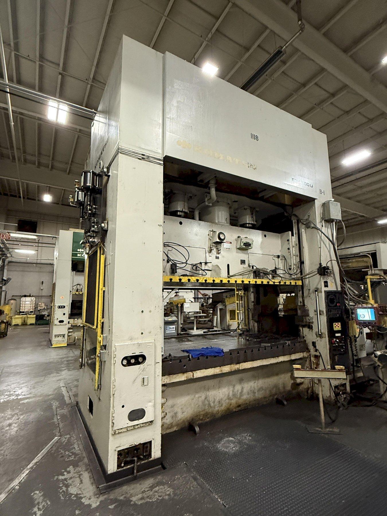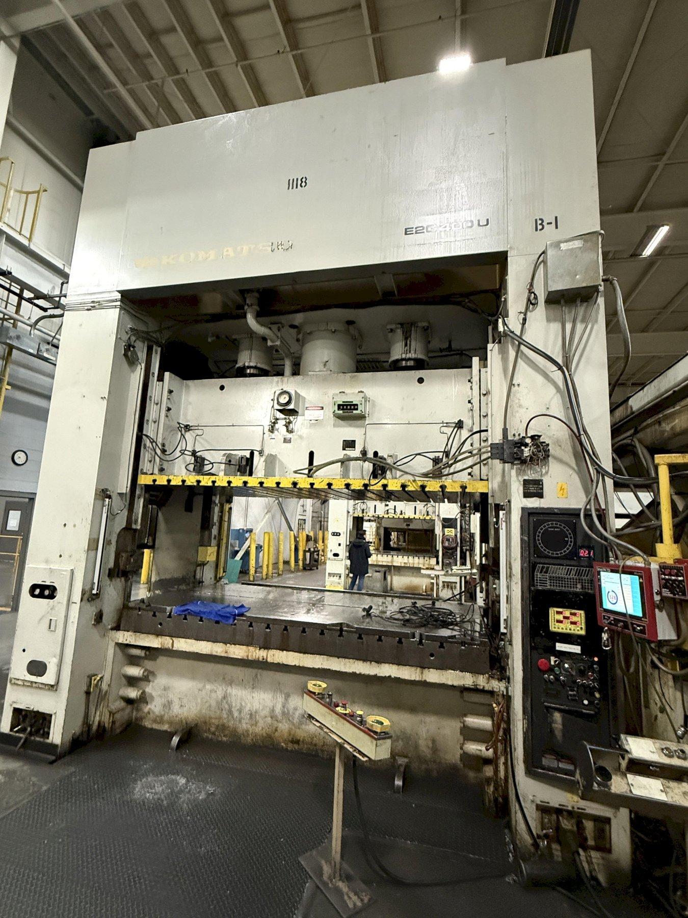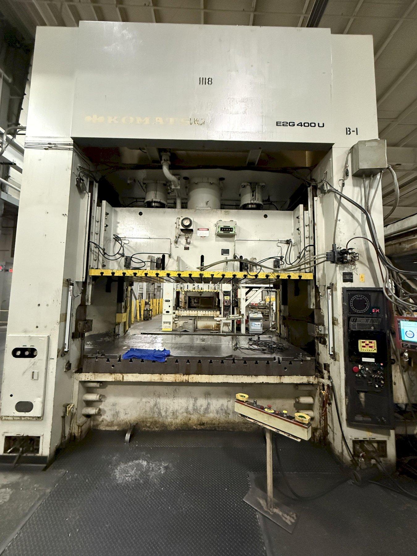 Optimize your production capacity with this 400-ton Komatsu E2G-400 Straight Side Mechanical Stamping Press. This 1990 floor-standing press offers a massive 122" x 61" bed and slide area, a 16.1" stroke, and a variable speed of 20-40 VSPM.