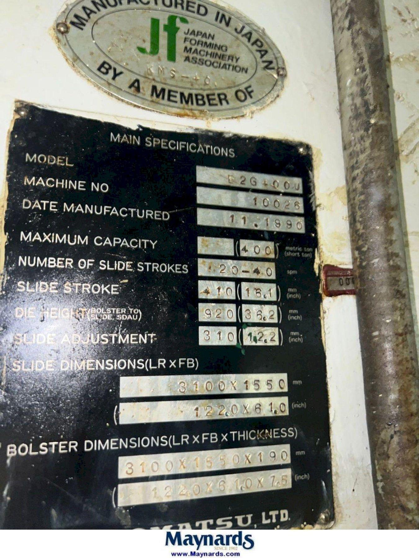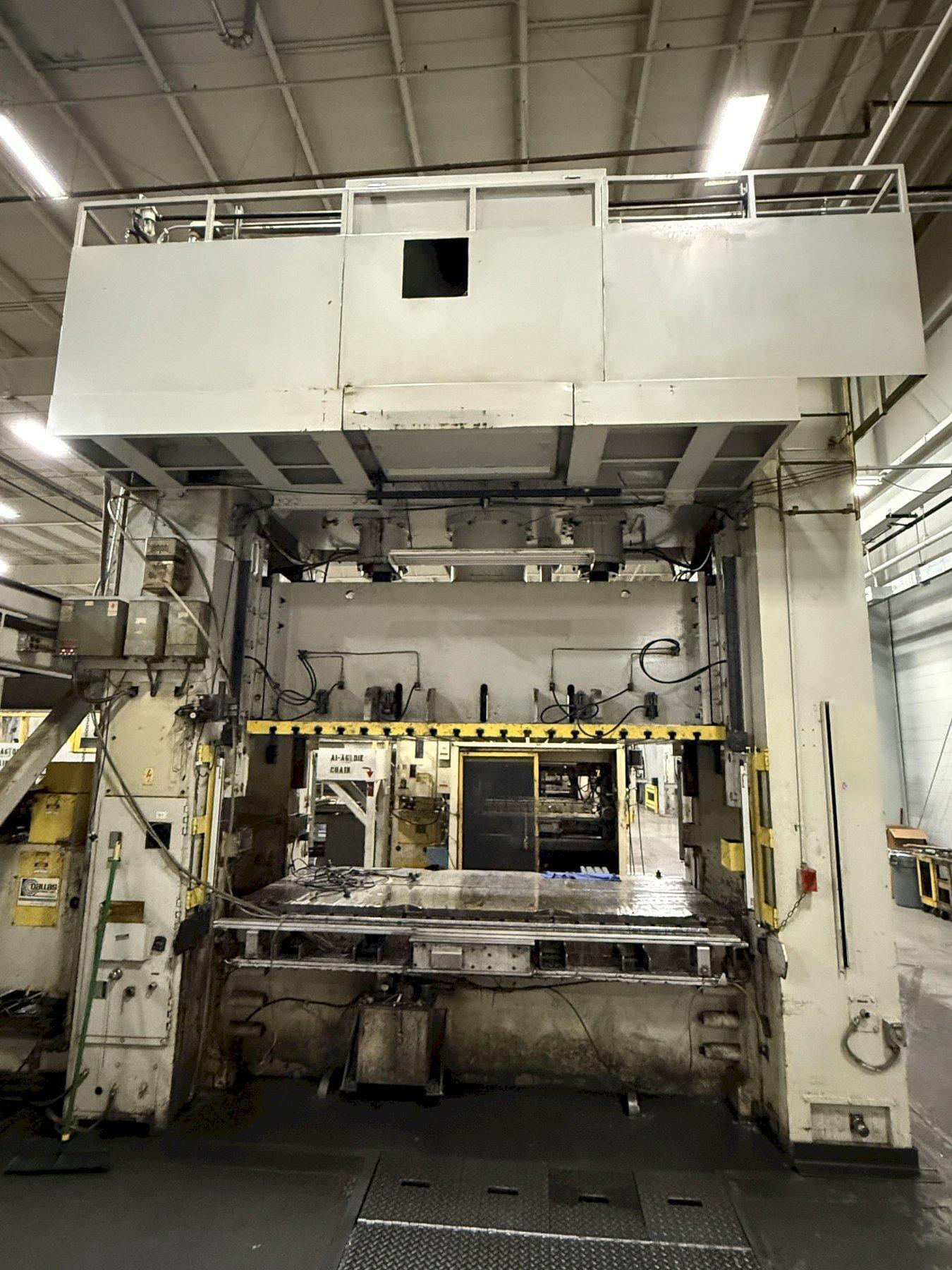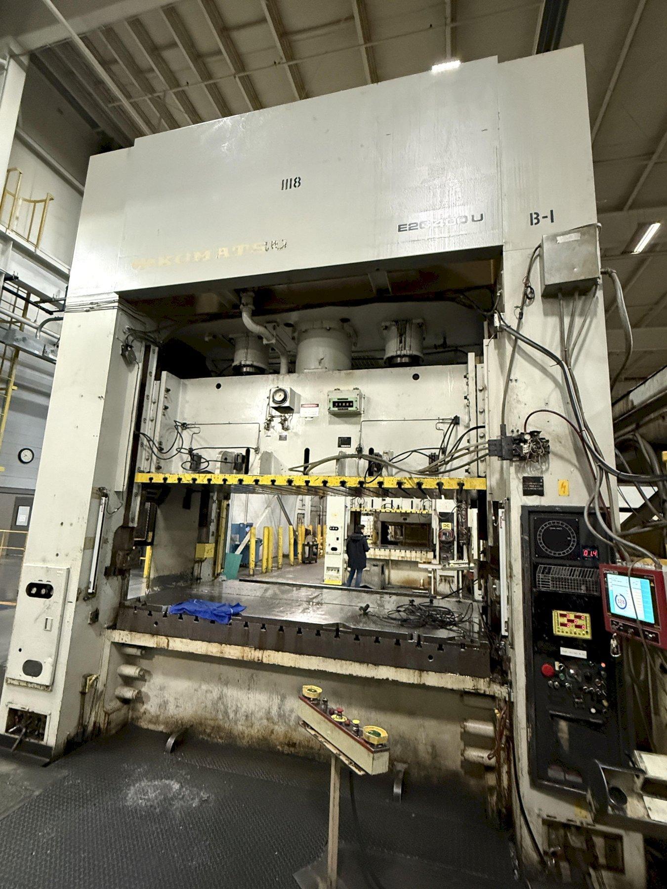 Optimize your production capacity with this 400-ton Komatsu E2G-400 Straight Side Mechanical Stamping Press. This 1990 floor-standing press offers a massive 122" x 61" bed and slide area, a 16.1" stroke, and a variable speed of 20-40 VSPM.
