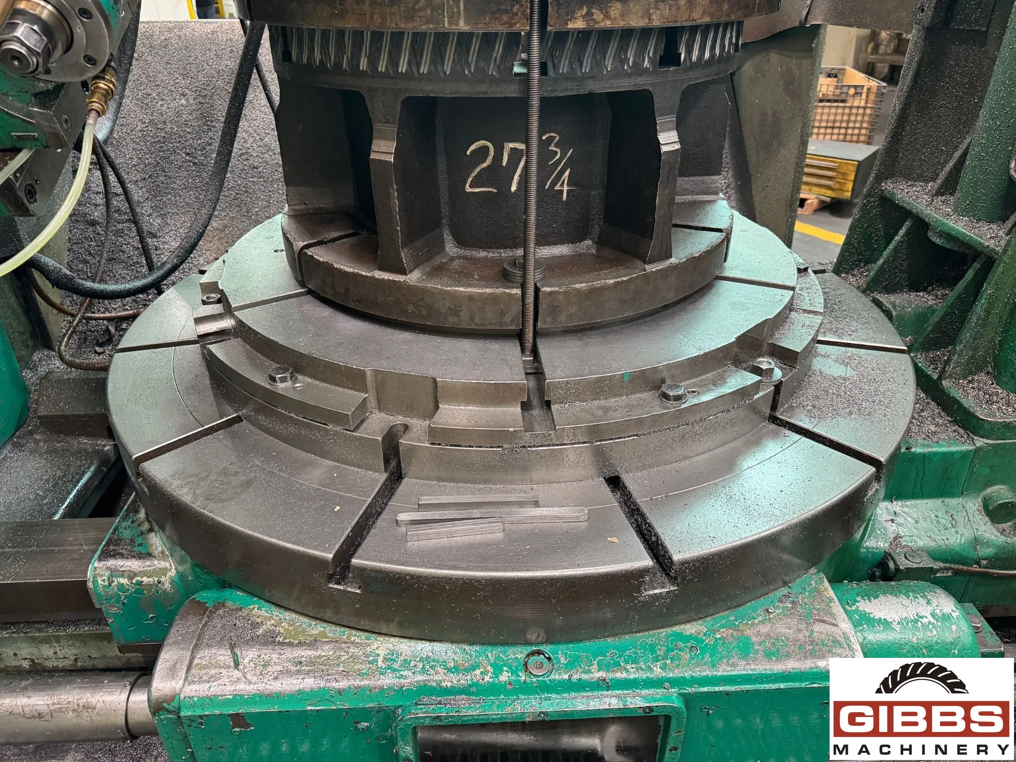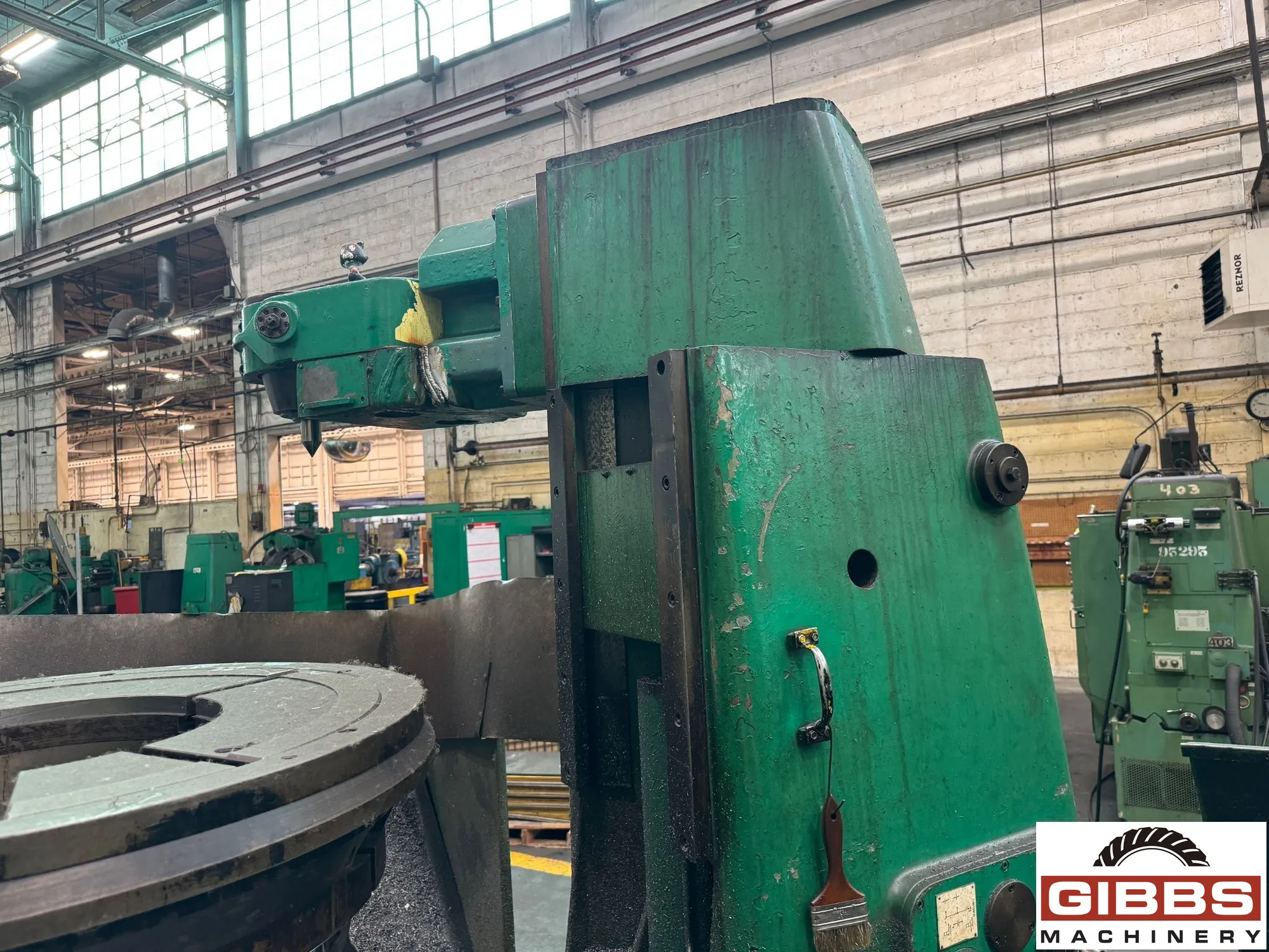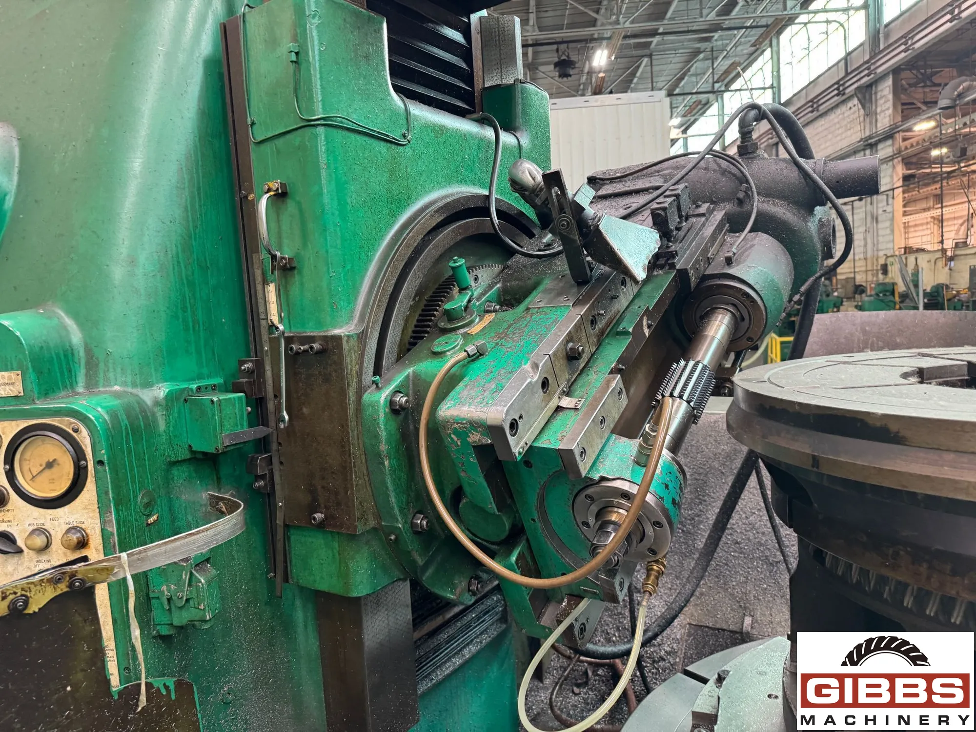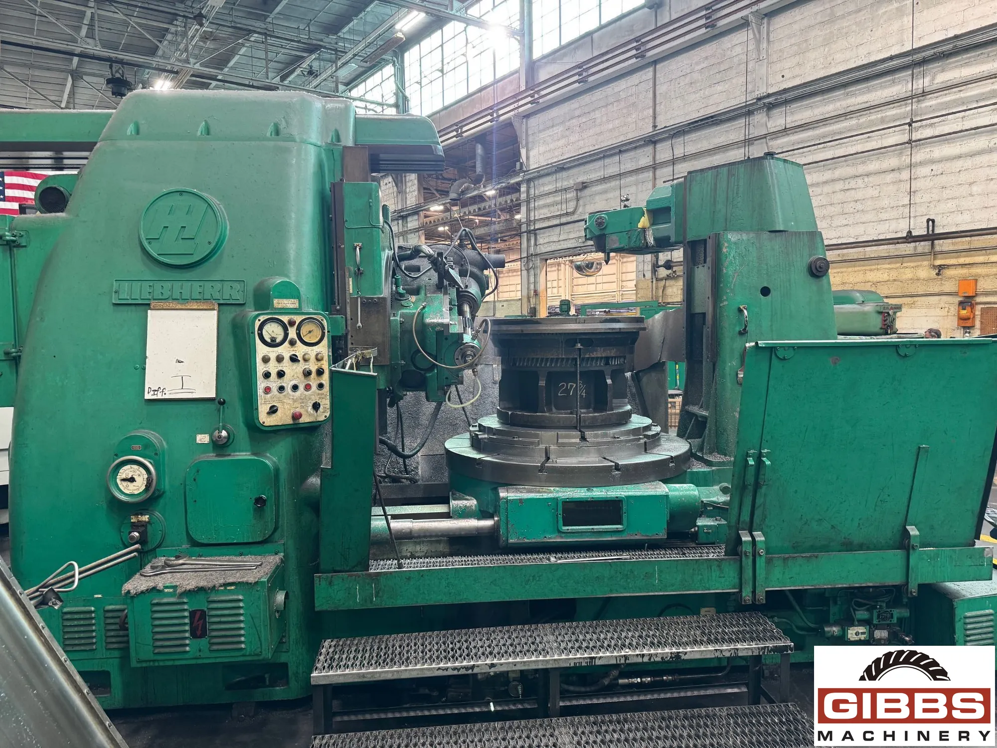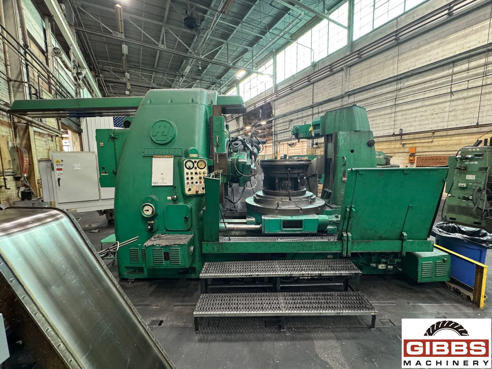 LIEBHERR L1500 Vertical Gear Hobber. Max workpiece diameter 1500 mm, axial travel 575 mm, hob speed 29-174 RPM. Equipped with differential, overarm, coolant system, swing away tailstock, and extra hob arbors. Ideal for precise gear cutting.