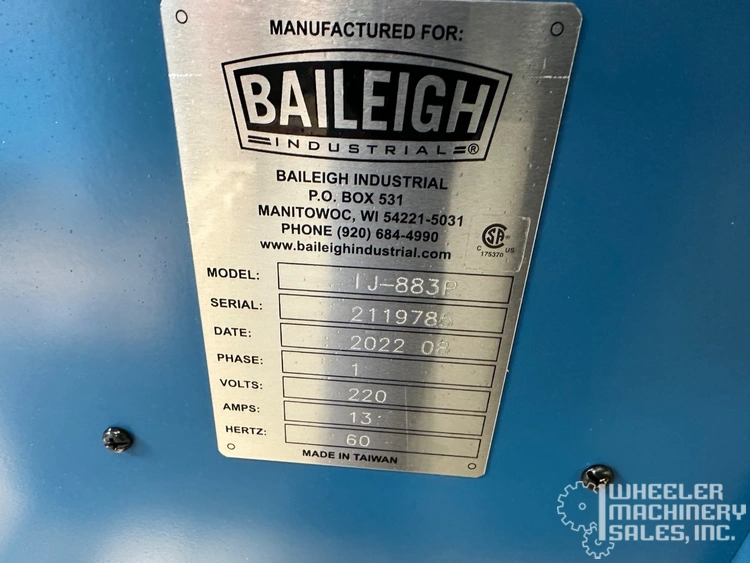 2022 BAILEIGH IJ883P Wood Jointer, used and well-suited for woodworking. Features an 83x8" in table, spiral head with 36 inserts, and a 3 HP motor. Operates at 220V, 1-phase. Includes a 4 in dust port and tilting fence. Cutter head speed is 5000 rpm.