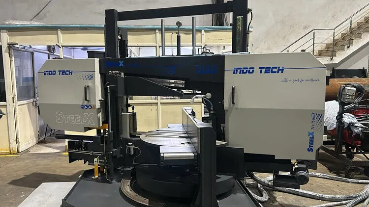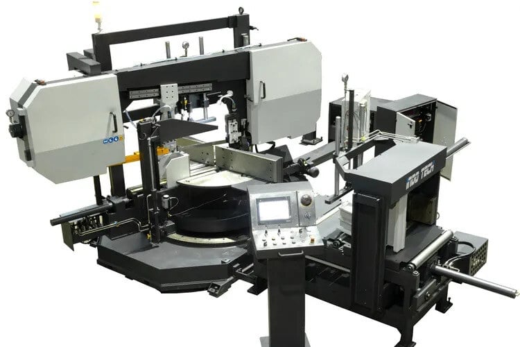 17.3” X 27.5” Fully Automatic Dual Column Horizontal Bandsaw with Omron CNC Control, 60° Left & 45° Right in Full Auto Mode, 40” Bar Feeder, Hydraulic Bundling Clamp, 40” Roller Table, Laser Alignment Light and Micro Mist Lubricating System.