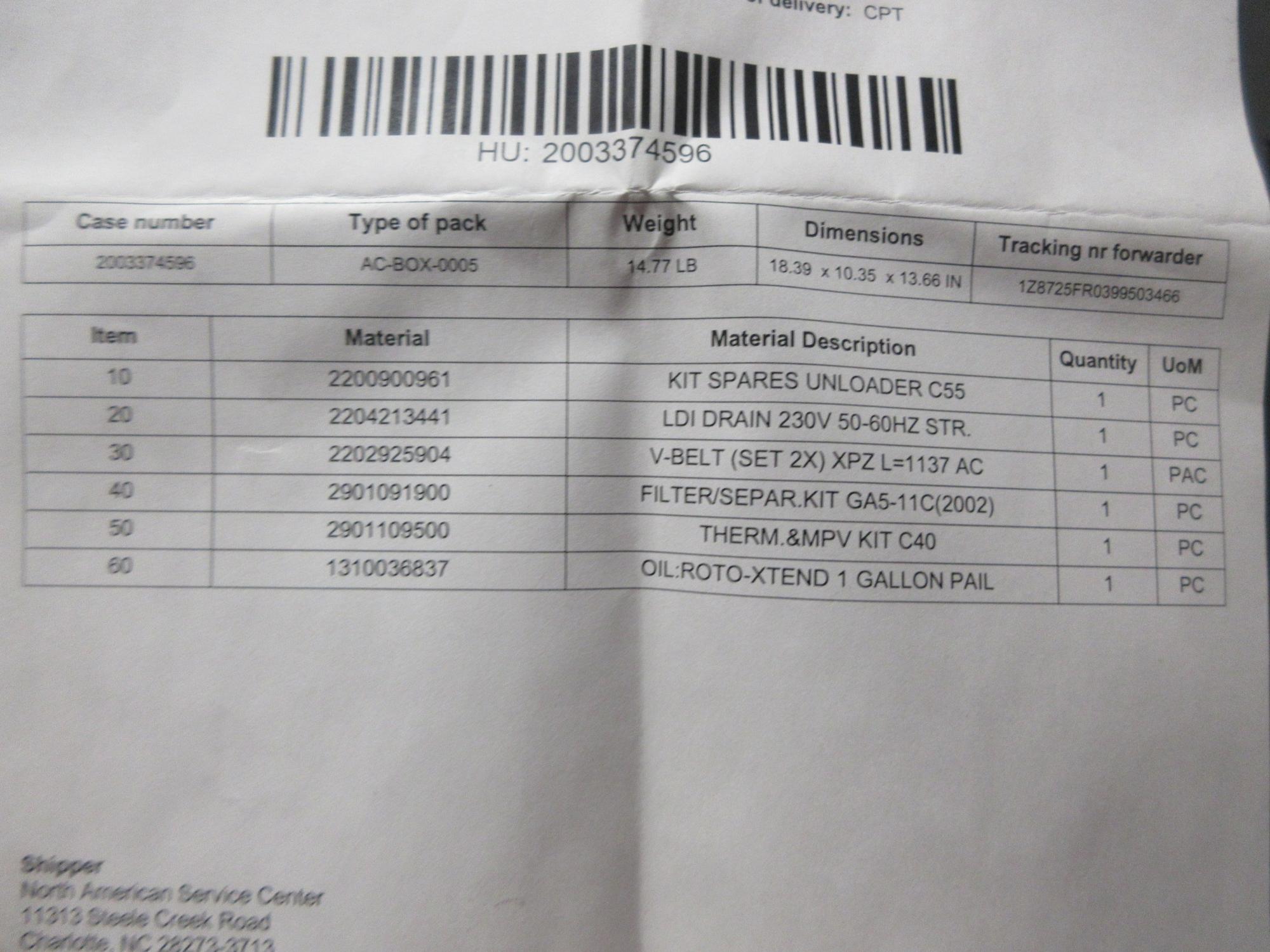 Equipped With: Spare Parts - Belts, Oil, Filter separator Kit, Thermostat Kit