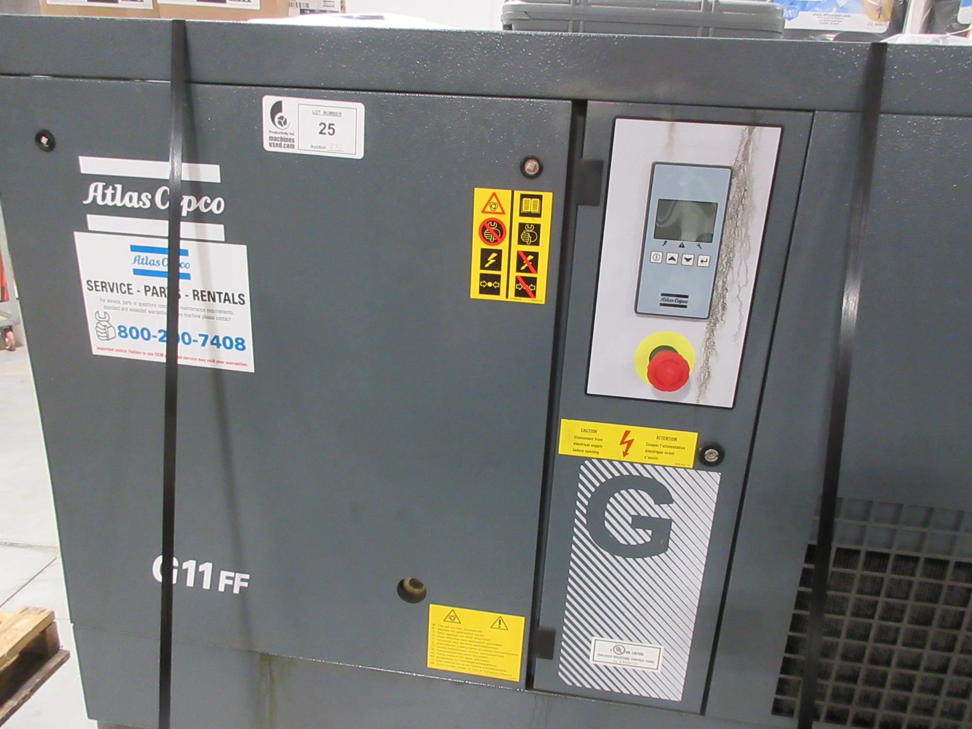Lot 25: Atlas Copco G11FF 15Hp Rotary Screw Air Compressor W/ Dryer, 120 Gal Air Tank 125 PSI & Spare Parts