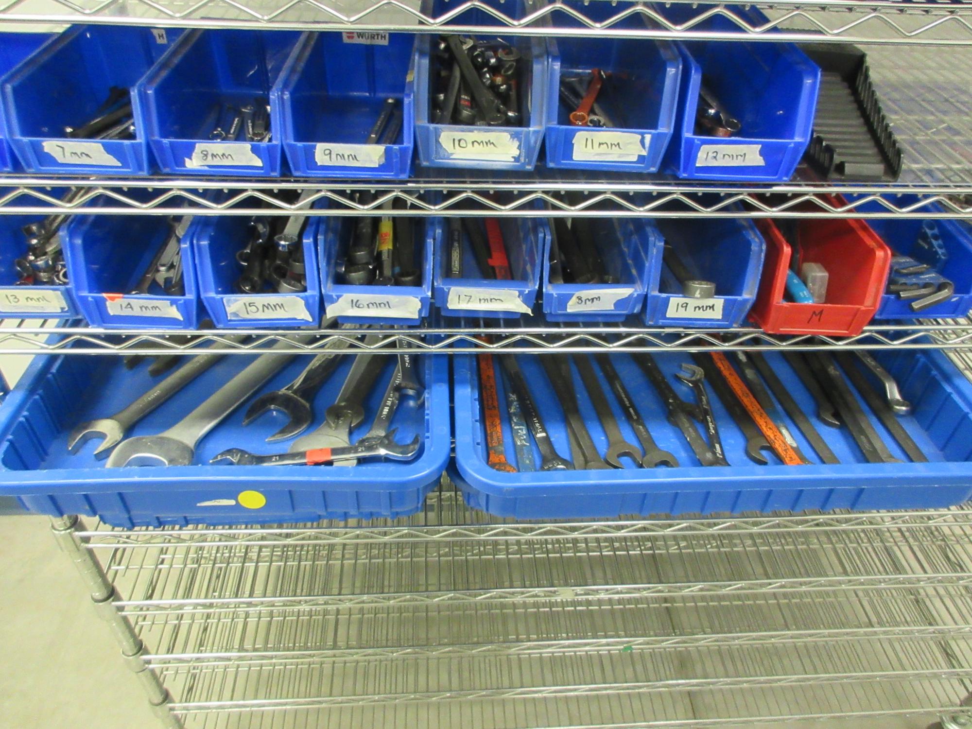 Lot 168: Hand Tools, including Box End Wrenches, Ratchets, Sockets and MORE on Quantum 11-Shelf 60" x 24" 78" Metal Wire Rolling Cart