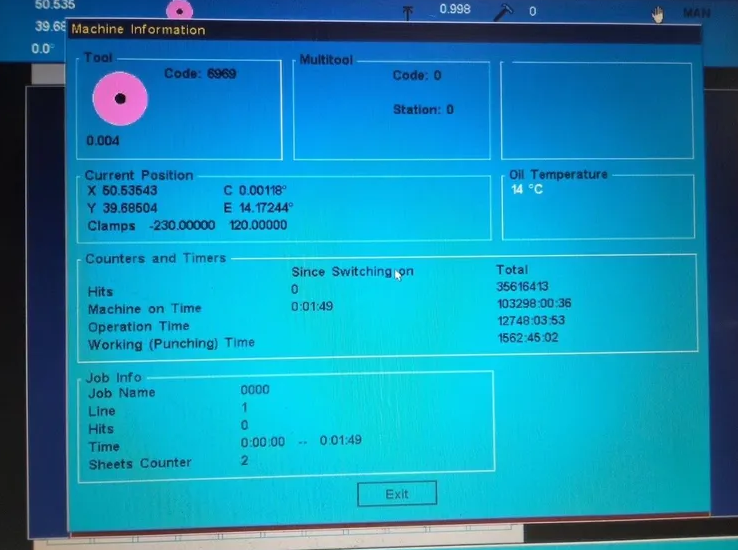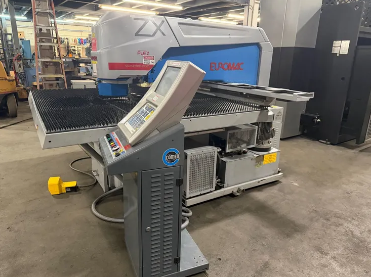 33 Tons, 40” X 50” CNC Turret Punch with Euromac CNC Control, Accepts up to a 10 Station Multi Tool, 360° Bi-Directional Rotation of Tooling and Brush Table.