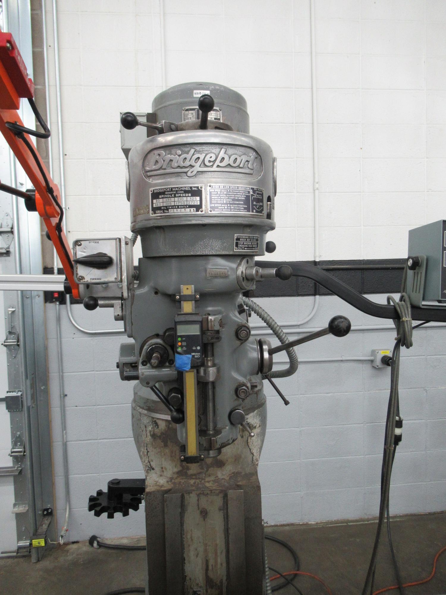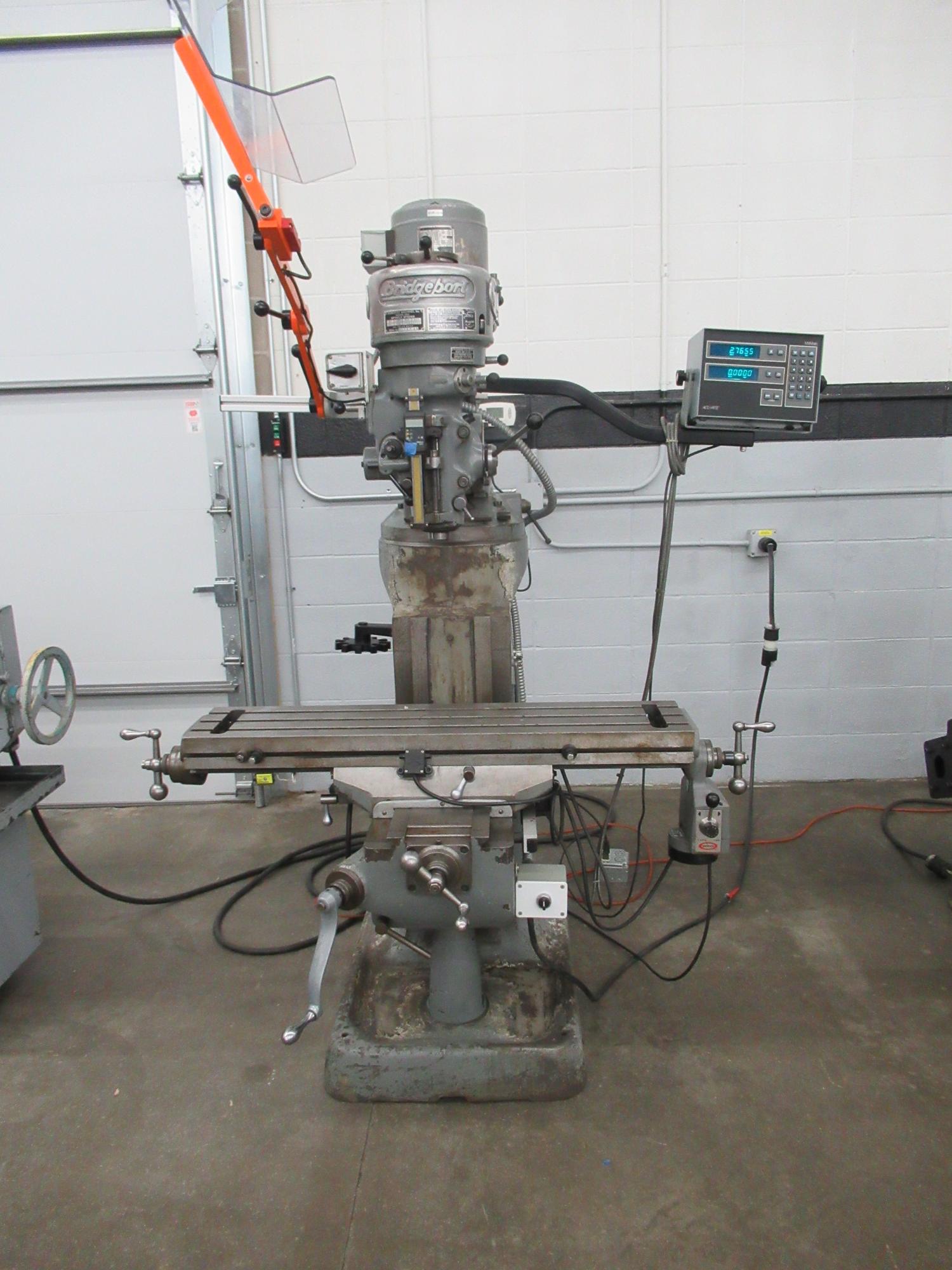 Acu-Rite Millmate 2-Axis Digital Readouts, Servo Variable Speed X-Axis Power Feed, Power Quill Feed, Mitutoyo Digital Quill Scale, 9"x42" Table, Quill Handle, Knee Handle, Spinning Collet Rack, Articulating Face Shield, Draw Bar