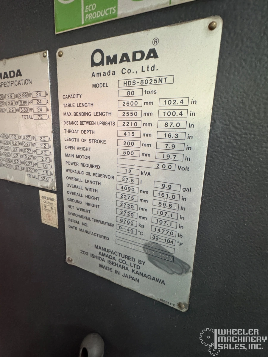 2013 Amada HDS 8025NT Servo-Hydraulic Press Brake, used. 80-ton CNC with 2,500 mm length, 8-axis control, AMNC-PC controls, and a 5-axis backgauge. Features fast speeds and hybrid drive system. Compact dimensions at 161" x 89" x 107", 14,770 lbs.