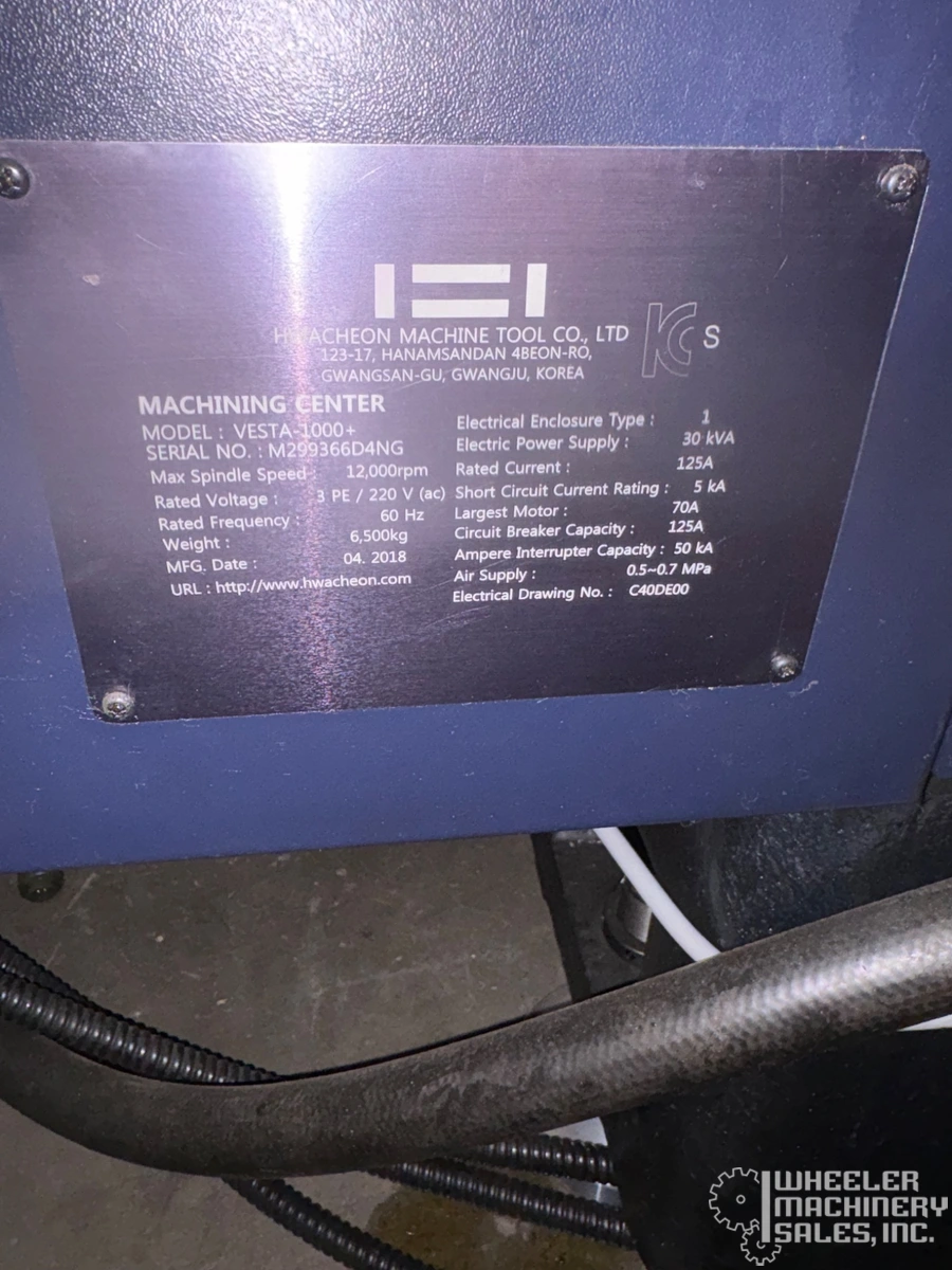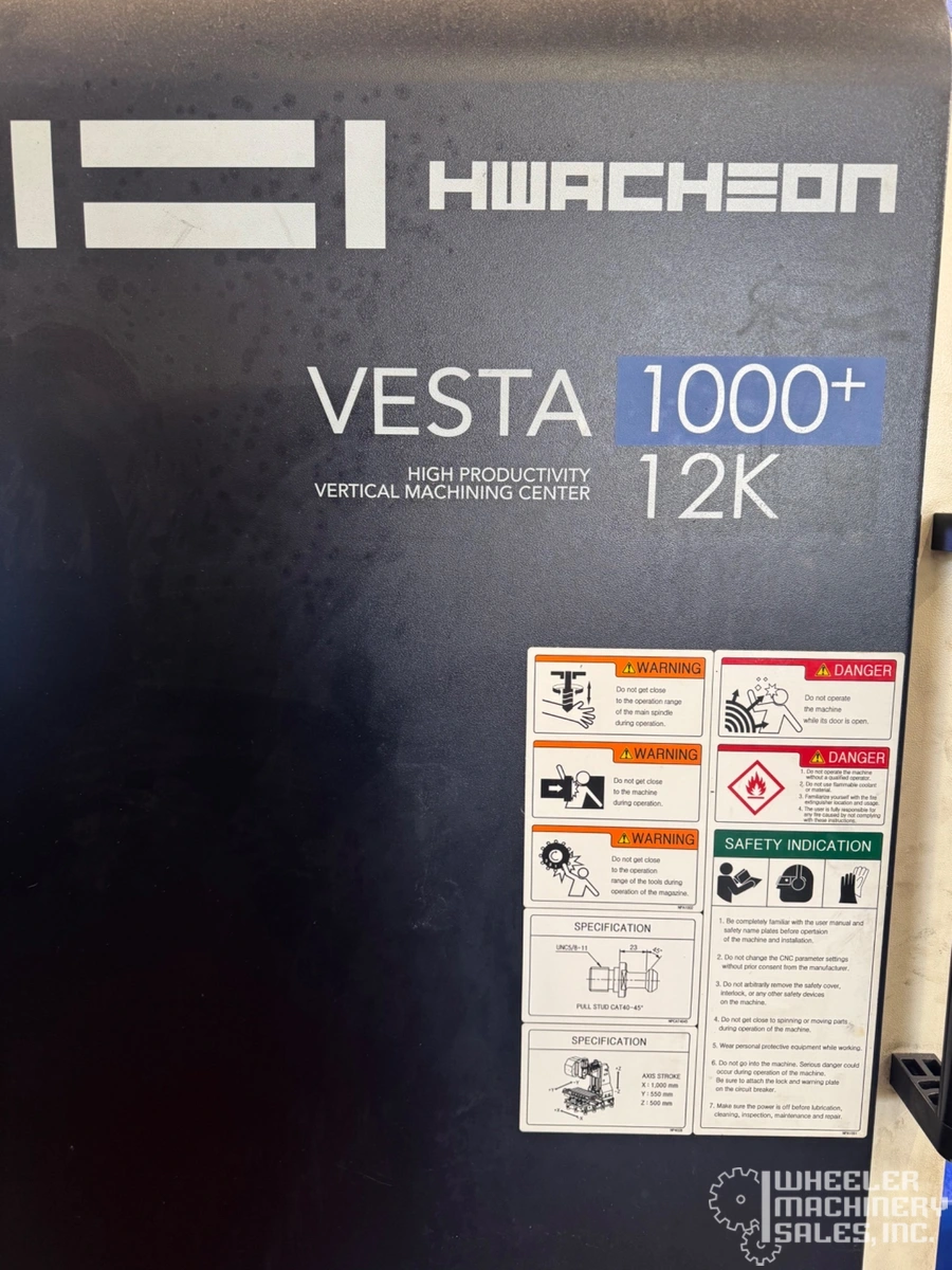 2018 HWACHEON Vesta 1000+ Vertical Machining Center: Used, features a 1,000 mm X-axis, 550 mm Y-axis, 500 mm Z-axis, 15 kW power, 10,000 RPM, BT-40 taper, and 24-tool ATC. Ideal for precision CNC tasks with a robust 3-axis setup.