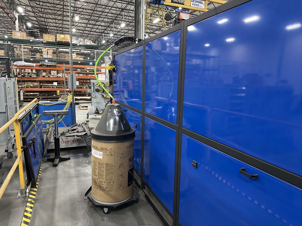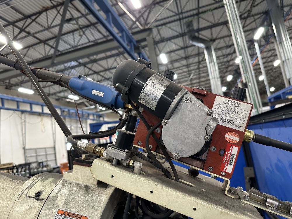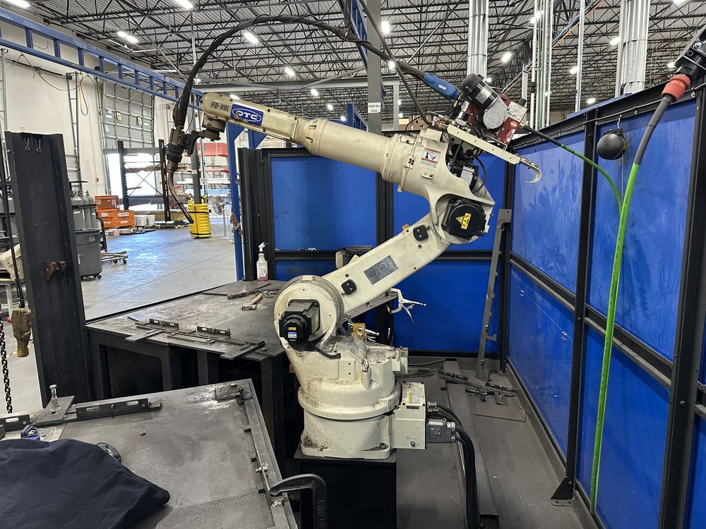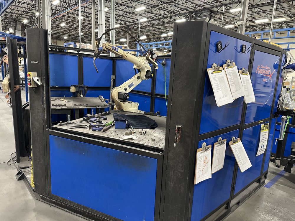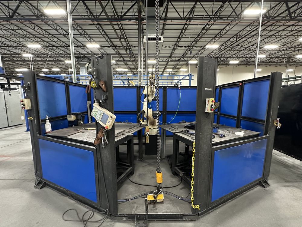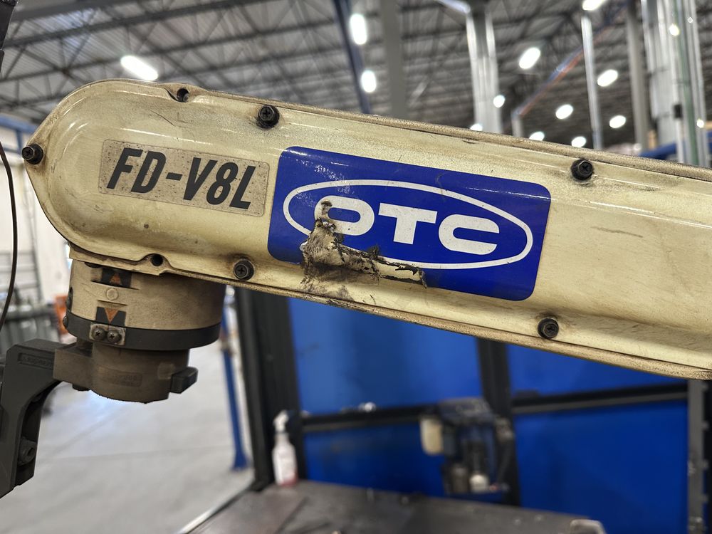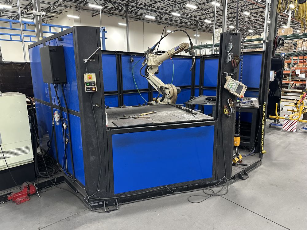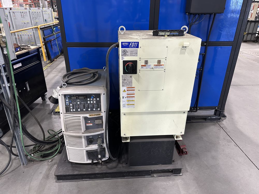 Welding Enclosure w/ Auto Doors, 2 Welding Tables, OTC FD-V8L Robot w/ FD11 Control, OTC Welbee P500L Welder, w/ AF-4012 Feeder, Torch Cleaner