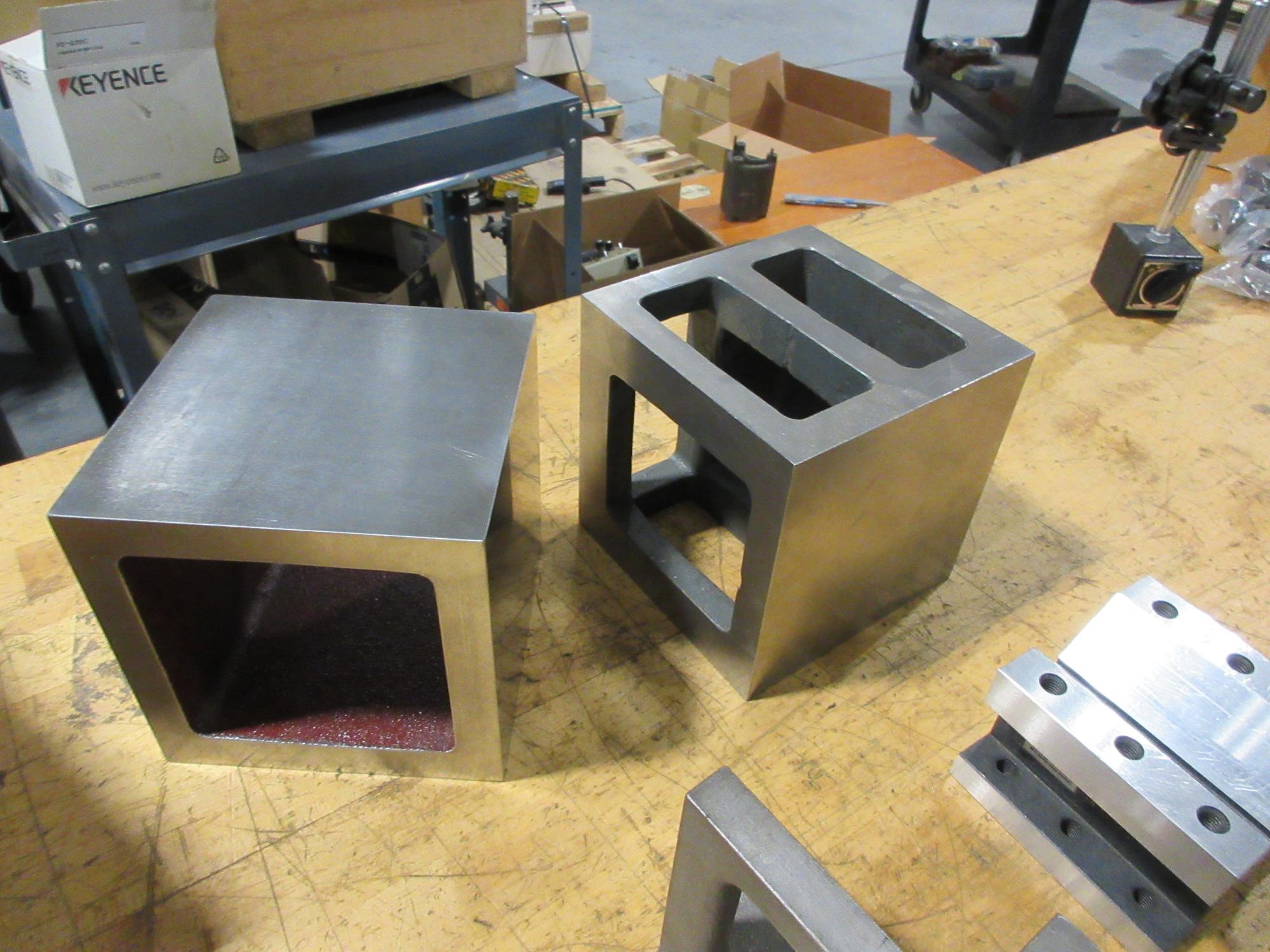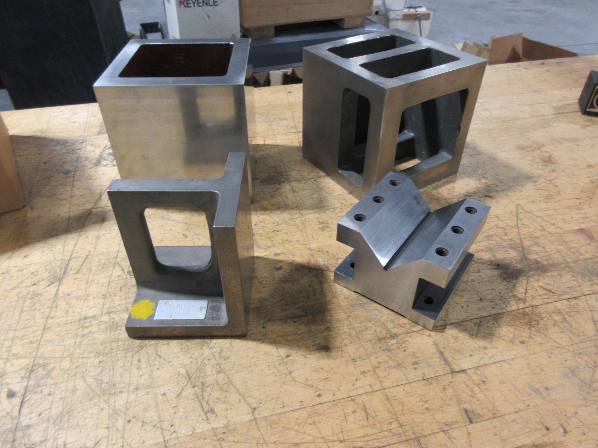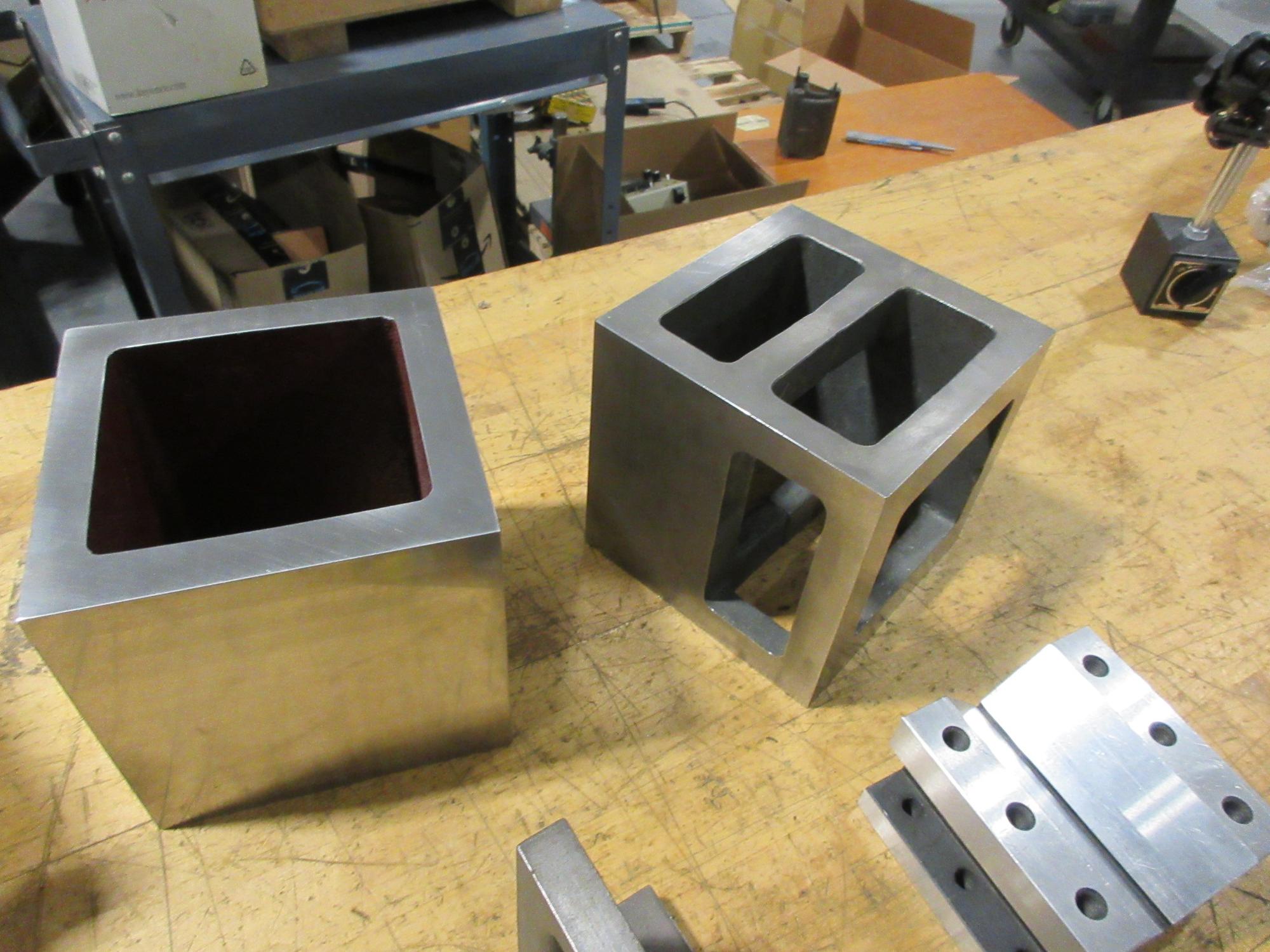 Lot 258: Precision Ground Squares 6x6x6", Angle Plate 5"x4.125"x4.125", Vee Block 4.125"x4.125"x3"