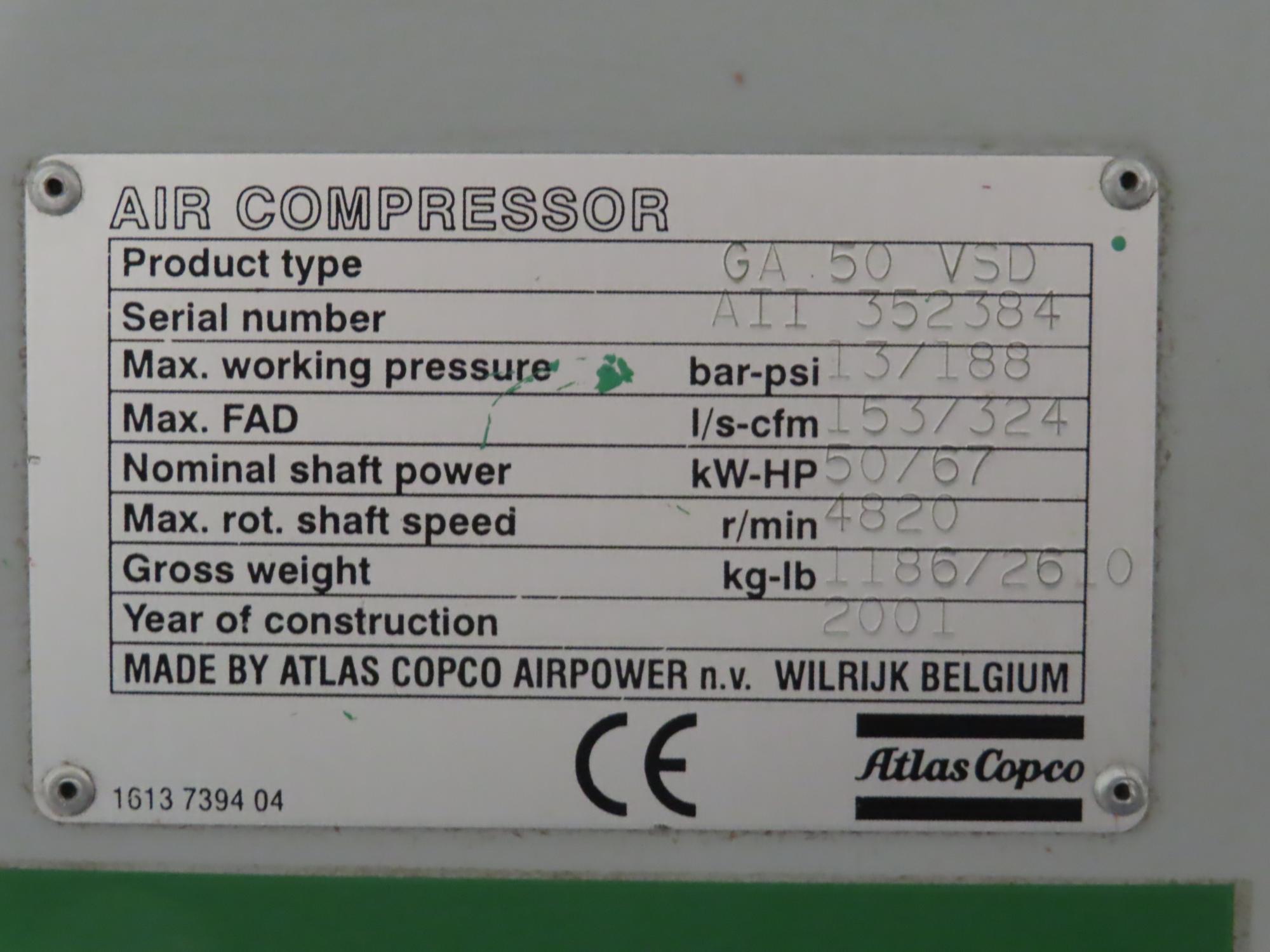 Manufacturer: Atlas Copco Model: GA 50 VSD Year: 2001 Serial Number: AII 352384
