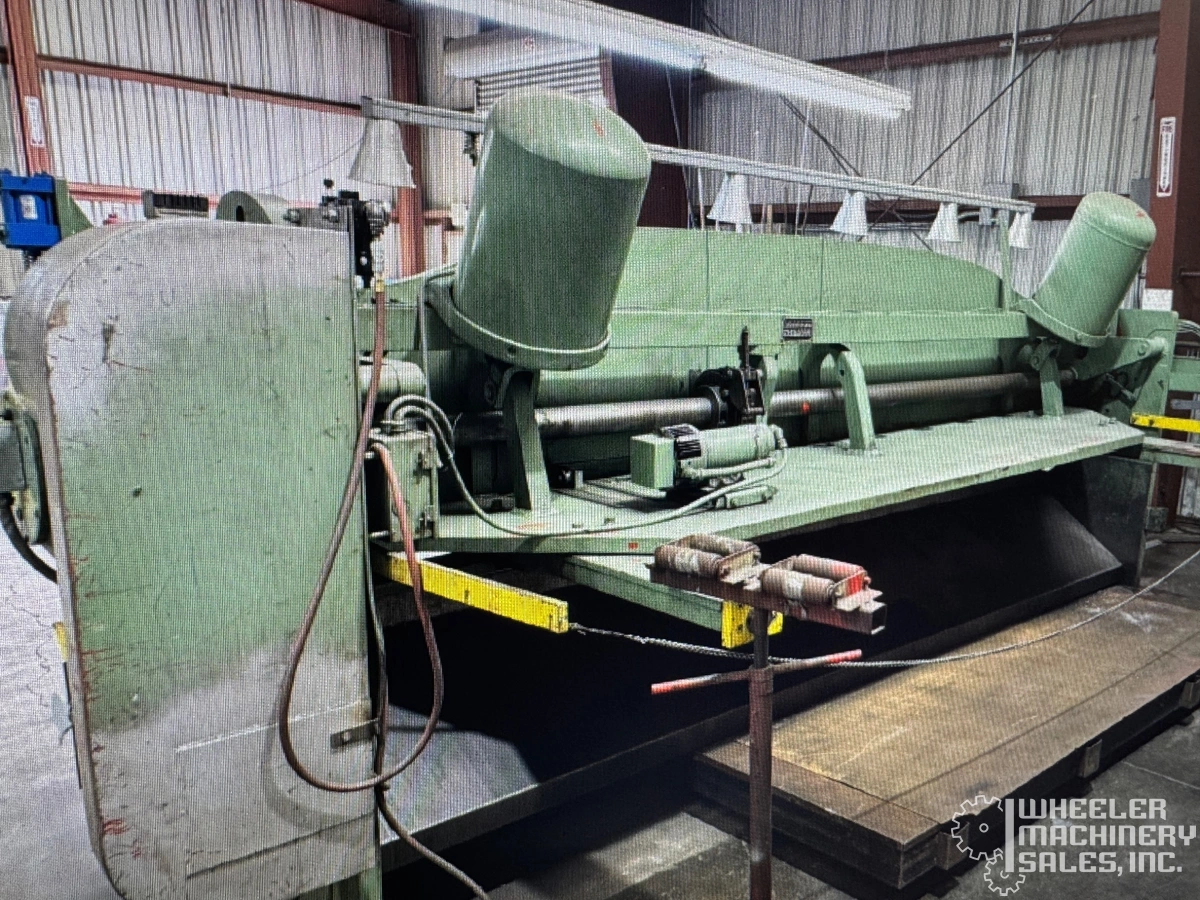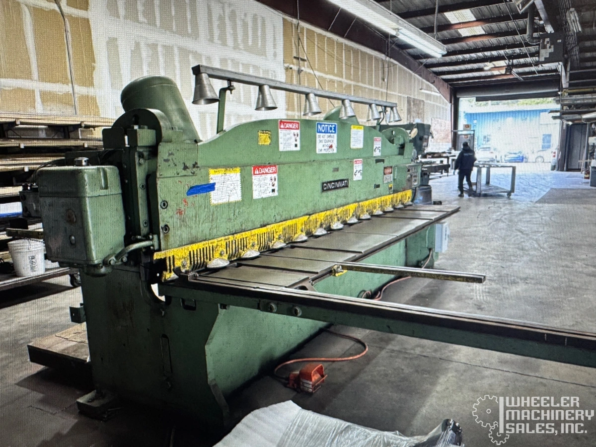 Used Cincinnati 1412 Mechanical Power Squaring Shear, capacity 3/16" x 12'. Features 36" front-operated back gauge range, squaring arm, foot treadle, and automatic lubrication system. Motor: 15 HP. Dimensions: 188” W X 84” D X 80” H. Weight: 22,600 lbs.
