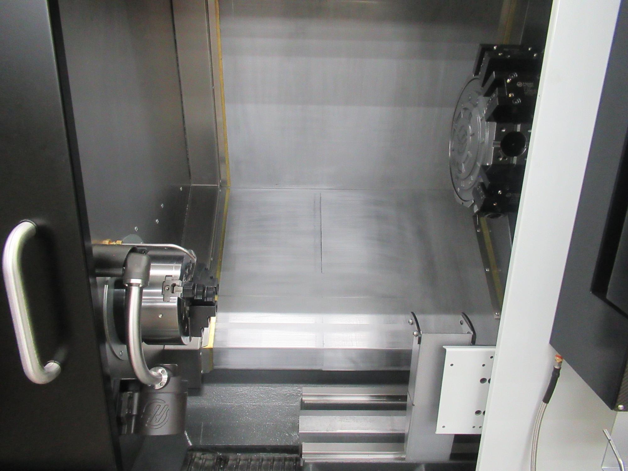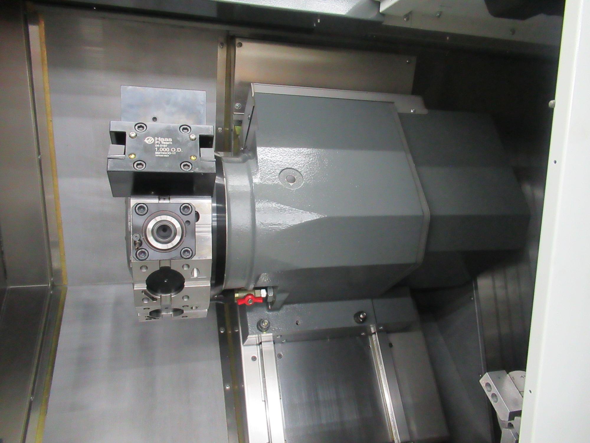 Haas NextGen CNC Control, 10" 3-Jaw Chuck on Main Spindle, 8" 3-Jaw Chuck on Sub Spindle, 12-Station Turret (BTM-65) with Live Milling and Y-Axis Capability, Automatic Tool Presetter, CNC Control Cabinet Cooler, Enclosure Exhaust System, High Pressure Coolant (300 PSI), Auxiliary Coolant Filter, Auto Jet Air Blast on Main Spindle, Jet Air Blast on Sub Spindle, 6000 RPM Maximum Live Milling Upgrade, Parts Catcher, 2-Radial Live Tool Holder, 1-Axial Live Tool Holder, Assorted Boring Bar and Stick Tool Holders (approx. 9 total), User Definable Macros, Rigid Tap, Spindle Orientation, Visual Programming System, Keys, 7-Drawer Cabinet.